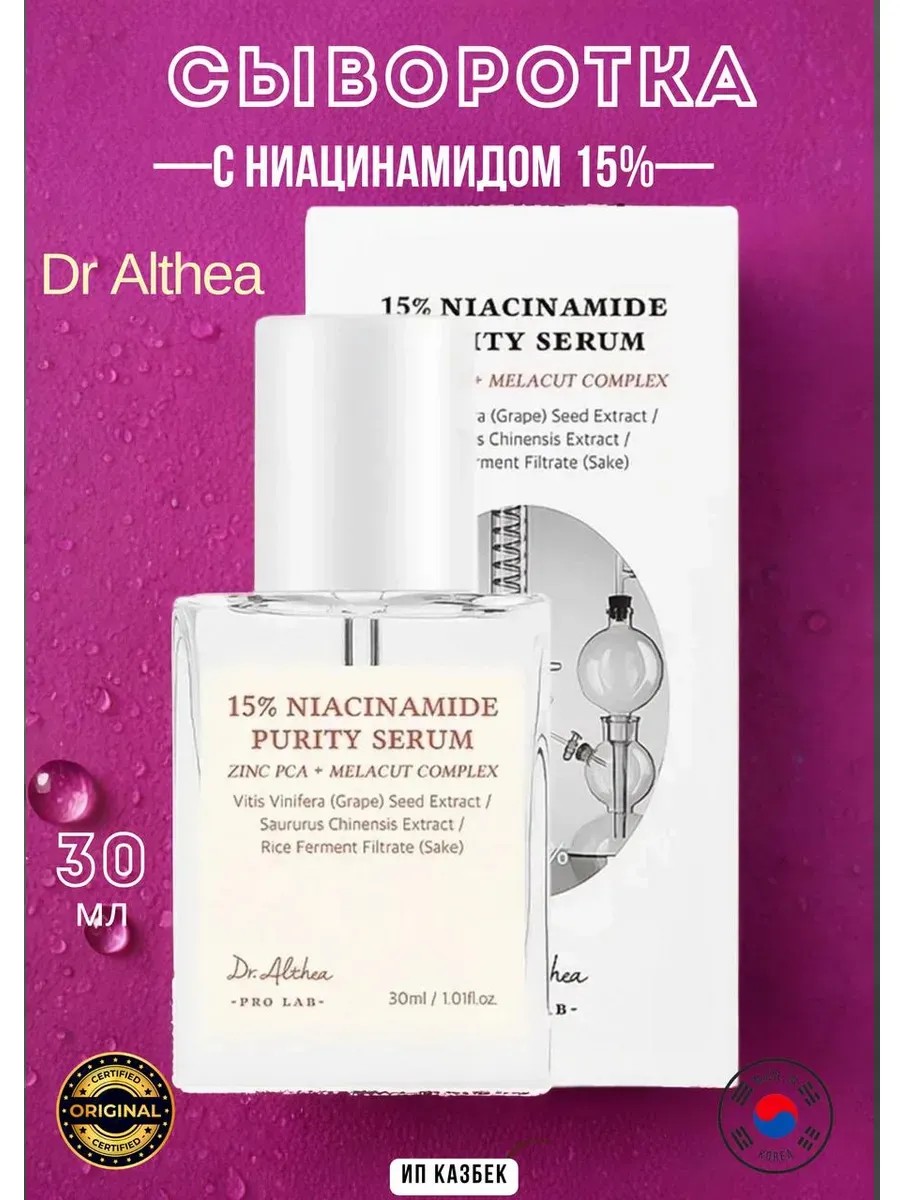 Dr. Althea Niacinamide Purity Serum, a brightening serum with niacinamide and zinc, corrects dull and uneven skin tone, improves complexion, restoring tone and a healthy glow. It helps eliminate age spots of various origins and prevents the appearance of post-acne. It has an antibacterial effect and heals inflammation. The product normalizes sebum production and reduces sebum production throughout the day. It helps lighten sebaceous filaments and tightens enlarged pores. The serum has a light gel consistency and leaves no stickiness or oily shine. Key active ingredients: 15% niacinamide works intensively for comprehensive skin health. It has a gentle brightening effect, slows melanin production, and prevents the formation of age spots. The MELACUT complex (purslane, grape seed, saurus, and fermented rice extract) provides antioxidant protection, has antibacterial and sebum-regulating properties, improves complexion, and stimulates collagen synthesis. Zinc PCA regulates sebaceous gland function and prevents excessive sebum production. It reduces oiliness, disinfects, and has a mild astringent effect. Tea tree oil has antiseptic, anti-inflammatory, and antibacterial properties, promotes acne healing and prevents new breakouts, cleanses, and tightens pores. Trehalose is a polysaccharide that binds water molecules, thereby maintaining optimal hydration levels. Suitable for normal, combination, and oily skin. Directions: Apply the desired amount of serum to toned skin, and finish with cream.