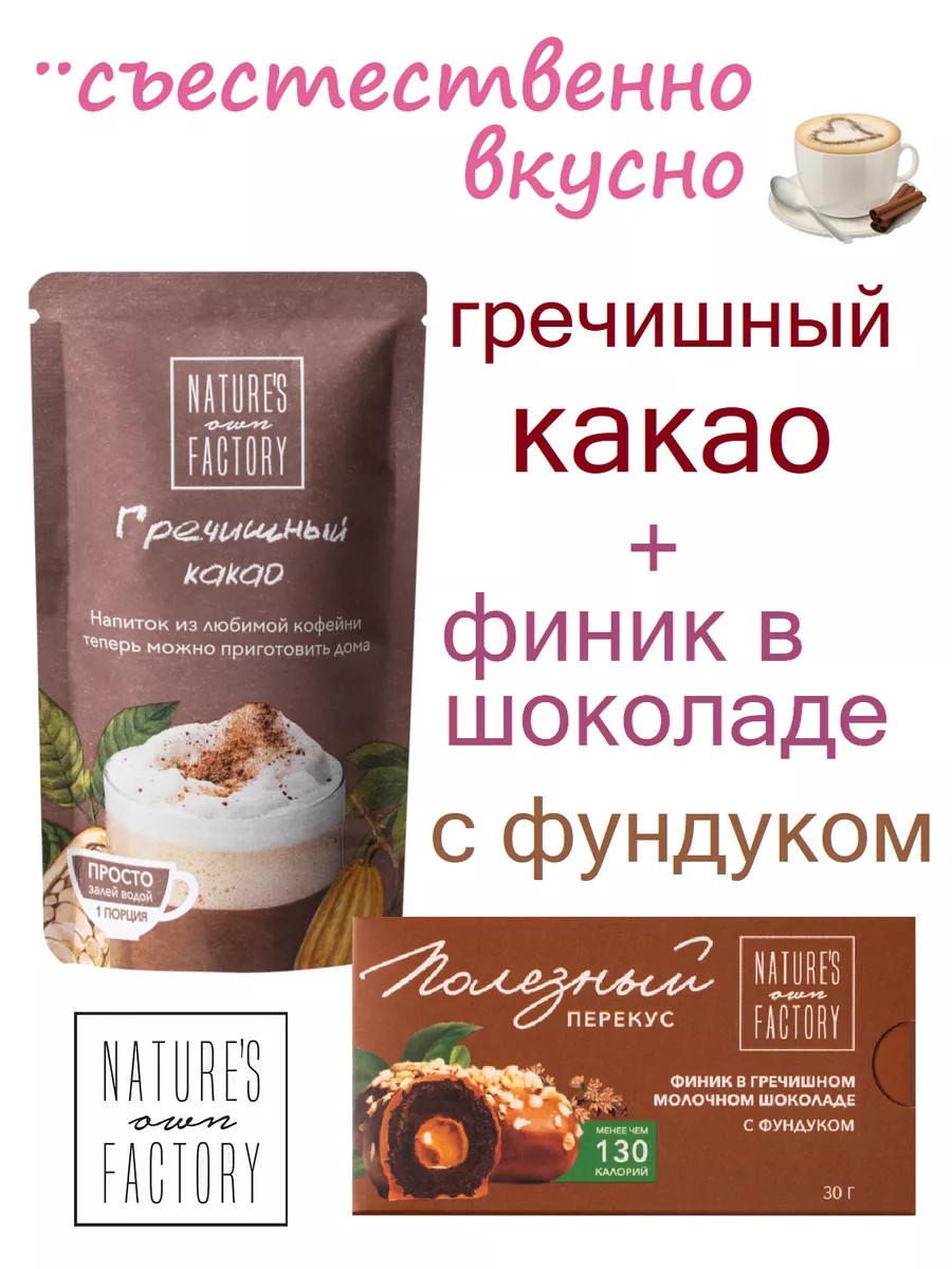 Ароматный какао с шоколадным вкусом и нежный финик с шоколадной молочной фундучной пастой внутри и покрытый молочным гречишным шоколадом не оставят вас равнодушными,