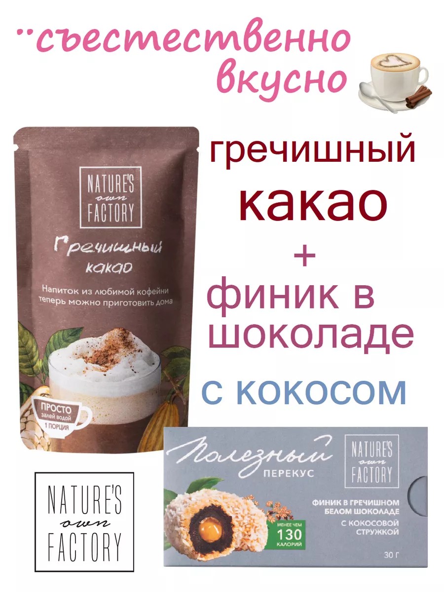 Ароматный какао с шоколадным вкусом и нежный финик с шоколадной кокосовой пастой внутри, покрытый белым гречишным шоколадом, не оставят вас равнодушными.
