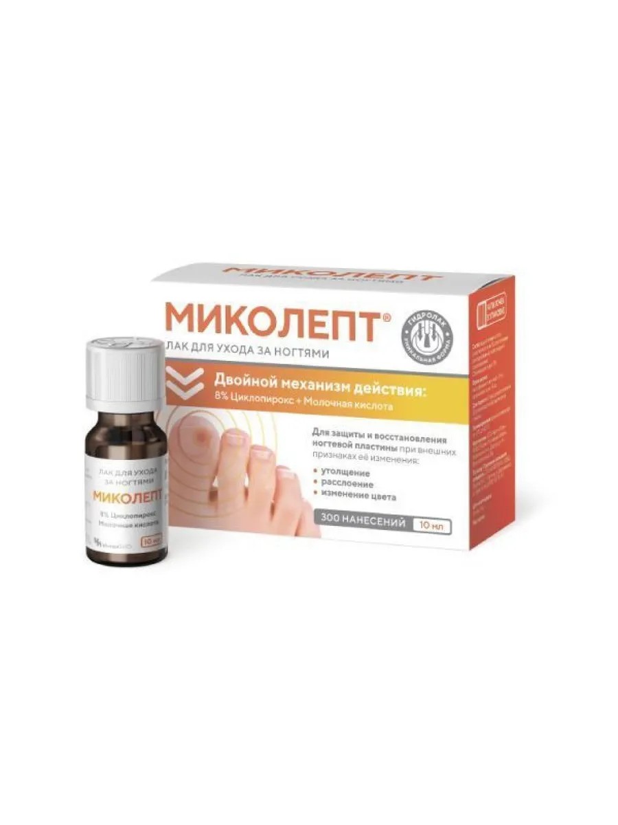 Лак для ухода за ногтями с признаками поражения грибком МИКОЛЕПТ специально разработан и предназначен для восстановления и защиты ногтевой пластины, поврежденной в результате грибкового поражения (онихомикоз).Применяется в тех случаях, когда пораженный участок составляет 1/2 и менее ногтевой пластины.При более обширных поражениях необходимо обратиться к врачу дерматологу.Уникальный двойной механизм действия за счет циклопирокса и молочной кислоты: прекращает рост и размножение грибов; восстанавливает здоровую ногтевую пластину; обеспечивает защиту от заражения грибком.