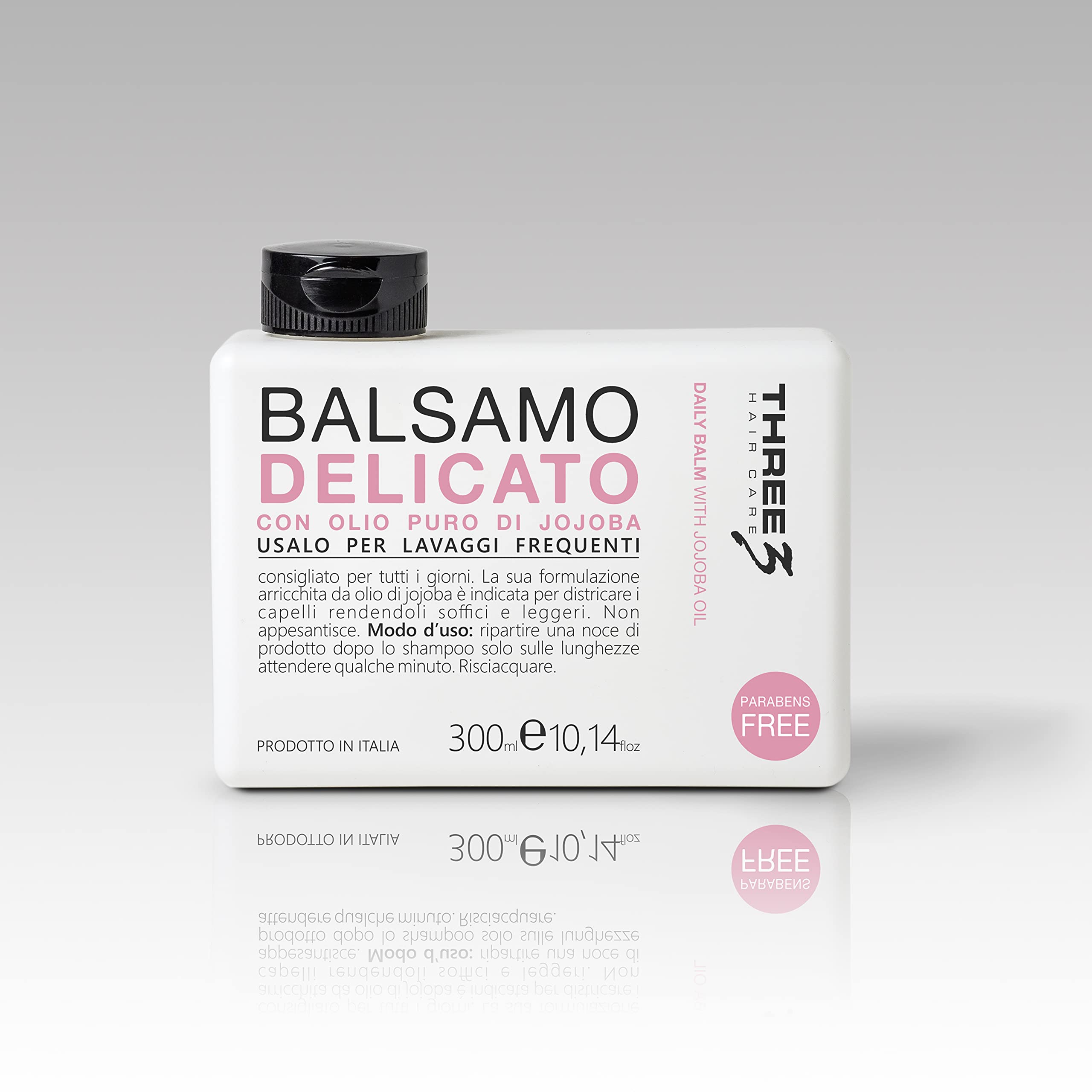 Recommended for every day. The formula enriched with jojoba oil is suitable for detangling the hair and making it soft and easy. No weight. Size: 300 ml.Without parabens.Three Balsem Delicato olie Jojoba vers wasmiddel zonder parabenen, 300 ml Aanbevolen voor elke dag. De met jojoba-olie verrijkte formule is geschikt om het haar te ontwarren en het zacht en gemakkelijk te maken. Geen gewicht. Formaat: 300 ml.Zonder parabenen.
