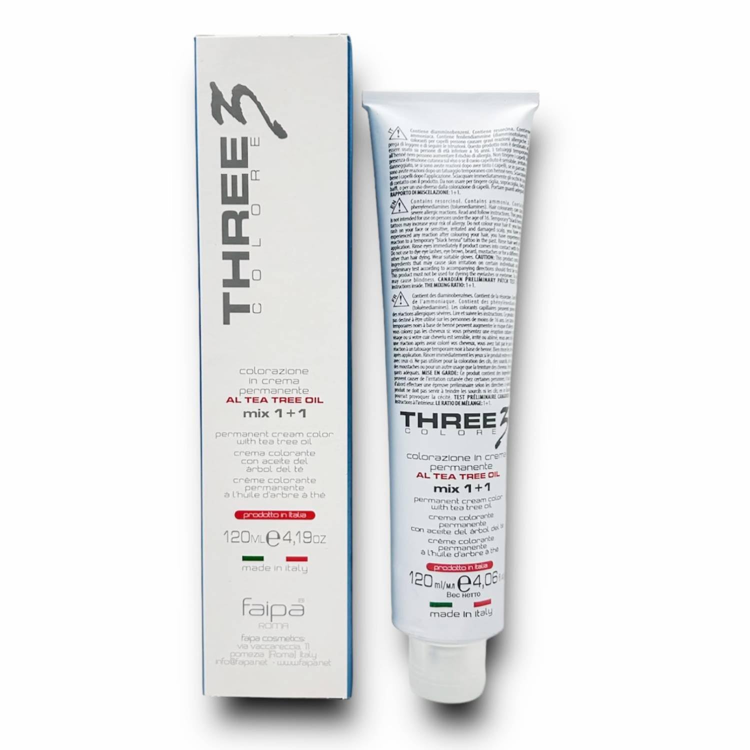 This is a permanent cosmetic hair color cream enriched with soothing and protective tea tree essential oil. Formulated to guarantee worry-free color results, it is easy to use and free of strong ammonia fumes. It ensures excellent color stability over time and resistance to fading. It guarantees complete and natural gray coverage while providing a natural, opaque, and long-lasting result. Thanks to its high-quality trichological cosmetic formula, it respects even the most fragile hair, treating it gently and leaving it soft and shiny. This hair color is formulated with a creamy base containing tea tree essential oil and guarantees a gentle and progressive cosmetic action. Three Color guarantees a soft and easily mixable cream. Directions: Wear the gloves provided in the kit. Mix the hair color cream with the activator according to the instructions on the packaging or in the leaflet. Mix well until you obtain a homogeneous mixture. Apply the mixture to dry, unwashed hair, distributing it evenly from roots to ends. Gently massage to ensure your hair is completely covered with the color mixture. Leave on for the time indicated in the instructions (usually between 30 and 45 minutes, depending on the desired color intensity and hair type). After the processing time, emulsify by adding a little warm water and gently massage. Rinse thoroughly with warm water until the water runs clear. Warnings: Before use, perform a skin sensitivity test 48 hours prior to application, even if you have previously used hair dyes. Apply a small amount of product behind the ear and allow it to dry. Do not wash the area for 48 hours. If allergic reactions such as itching, redness, or swelling occur, do not use the product. Avoid contact with eyes: In case of contact with eyes, rinse immediately with plenty of water and seek medical advice. Wear suitable gloves during all application steps to avoid direct contact with the product. Do not use on irritated skin. Keep out of reach of children. Do not swallow. Avoid inhaling product vapors during application. Store the product in a cool, dry place, away from heat and direct sunlight. Size: 120 ml SAFETY WARNING Warnings: Before use, perform a skin sensitivity test 48 hours prior to application, even if you have previously used hair dyes. Apply a small amount of product behind the ear and allow it to dry. Do not wash the area for 48 hours. If allergic reactions such as itching, redness, or swelling occur, do not use the product. Avoid contact with eyes.Warnings: Before use, perform a skin sensitivity test 48 hours prior to application, even if you have previously used hair dyes. Apply a small amount of product behind the ear and allow it to dry. Do not wash the area for 48 hours. Avoid contact with eyes: In case of contact with eyes, wear suitable gloves during all application steps to avoid direct contact with the product. Do not use on irritated skin. Keep out of reach of children. Do not swallow. Directions: Wear the gloves provided in the kit. Mix the color cream with the activator according to the instructions on the packaging or in the leaflet. Mix well until you obtain a homogeneous mixture. Apply the mixture to dry, unwashed hair, distributing it evenly from roots to ends. Gently massage to ensure your hair is completely covered with the color mixture. Leave on for the time indicated in the instructions (usually between 30 and 45 minutes, depending on the desired color intensity and hair type). This hair color is formulated with a creamy base enriched with tea tree essential oil, guaranteeing a gentle and gradual cosmetic action. Three Color ensures a soft and easily mixable cream. It provides excellent color stability over time and resistance to fading. It guarantees complete and natural gray coverage while delivering a natural, full-coverage, and long-lasting result. Thanks to its high-quality trichological formula, it respects even the most fragile hair, treating it gently and leaving it soft and shiny. This permanent cosmetic hair color cream is enriched with soothing and protective tea tree essential oil. Formulated to guarantee worry-free color results, it is easy to use and free of strong ammonia fumes.Faipa Three Color Colorant Permanent Pour Cheveux Crème Au Tea Tree Huile 120 ml (5N Châtain Clair Naturel, 120 Ml) 5N Châtain Clair Naturel 120 ml (Confezione da 1)DESCRIPTION DU PRODUIT DESCRIPTION DU PRODUIT C'est une crème colorante cosmétique, permanente, enrichie en l'huile essentielle d'arbre à thé à action apaisante et protectrice. Formulée pour garantir des couleurs en toute tranquillité de résultat, elle est facile à utiliser et est exempte d'intenses exhalations ammoniaques. Assure une excellente stabilité de couleur dans le temps et résistance au virage. Garantit une couverture totale et naturelle des cheveux blancs tout en donnant un résultat naturel, couvrante et durable. Grâce à la haute qualité cosmétique trichologique, il respecte les cheveux, même les plus fragiles, les traitant avec douceur et leur donne douceur et brillance. C'est une coloration formulée sur une base crémeuse à l'huile essentielle d'arbre à thé et garantit une action cosmétique douce et progressive. Three Color garantit une crème douce et facilement mélangeable. Utilisation : porter les gants fournis dans le kit. Mélanger la crème colorante avec l'activateur selon les instructions indiquées sur l'emballage ou dans la notice. Bien mélanger jusqu'à obtenir un mélange homogène. Appliquer le mélange sur cheveux secs et non lavés, en le répartissant uniformément des racines aux pointes. Massez doucement pour vous assurer que vos cheveux sont complètement couverts par le mélange colorant. Laisser agir pendant le temps indiqué dans les instructions (généralement entre 30 et 45 minutes, selon l'intensité de la couleur désirée et le type de cheveux). Après le temps de pose, émulsionner en ajoutant un peu d'eau tiède et masser douce