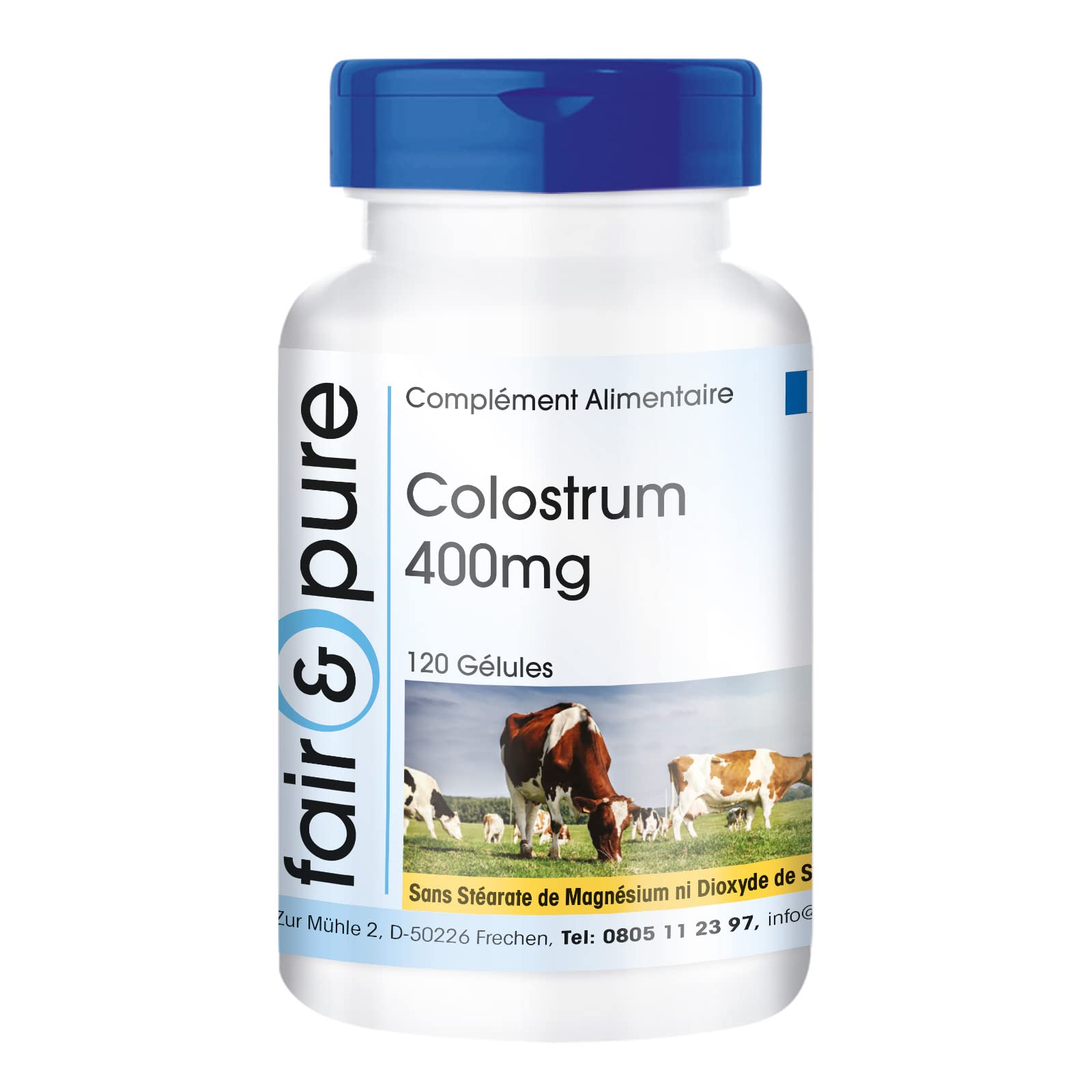 MICROBIOLOGICAL PURITY CONTROL according to HACCP standard - Raw materials from the EU and third countries. High assimilation: The principles of Fair Pure prohibit us from using sweeteners, colorings and additives. Colostrum capsules are free from gluten, magnesium stearate, silicon dioxide, colorings, flavors and artificial preservatives. Premium quality: All raw materials and finished products are regularly checked by independent institutes regarding hygiene and quality guidelines. For your health: Fair Pure colostrum capsules contain, per daily dose of 3 capsules, 1200 mg of colostrum, including 360 mg of immunoglobulin G. Colostrum is also known as primary colostrum, first milk or biestmilch.CONTROLE DE LA PURETÉ MICROBIOLOGIQUE selon la norme HACCP - Matières premières originaires de l'UE et des pays tiers. Haute assimilation : Les principes de Fair Pure nous interdisent d'utiliser des édulcorants, des colorants et des additifs. Les gélules de colostrum sont exemptes de gluten, de stéarate de magnésium, de dioxyde de silicium, de colorants, d'arômes et de conservateurs artificiels. Première qualité : Toutes les matières premières et tous les produits finis sont régulièrement contrôlés par des instituts indépendants concernant les directives d'hygiène et de qualité. Pour votre santé : Les gélules de colostrum de Fair Pure contiennent, par dose journalière de 3 gélules, 1200 mg de colostrum, dont 360mg d'immunoglobuline G. Le colostrum est également connu sous les noms de colostrum primaire, premier lait ou biestmilch.