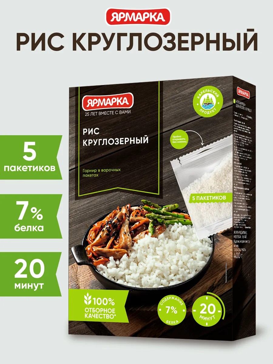 Cook delicious round-grain rice in bags effortlessly! Yarmarka brand rice is ideal for popular dishes like pilaf, risotto, porridge, and soups. In just a few simple steps, you'll have a ready-to-eat product packed with vitamins and nutrients.