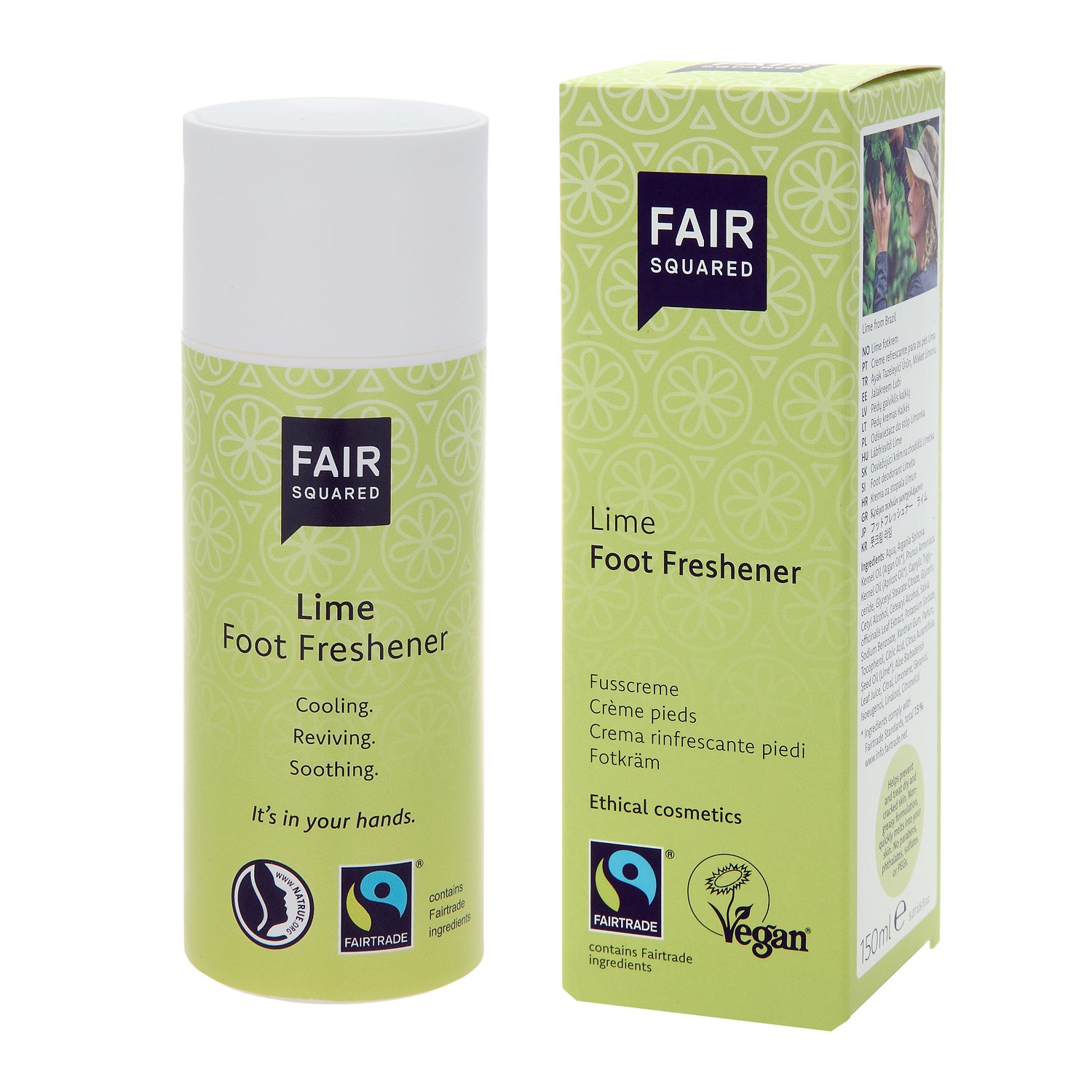 FAIR SQUARED Produkte tragen das NATRUE-Siegel für zertifizierte Naturkosmetik, das Siegel der Vegan Society, sind Halal und wurden in Zusammenarbeit mit ClimatePartner klimaneutralsiertFSC Mix zertifizierte Karton-Verpackung. Mit Fairtrade Argan Öl aus Marokko und Fairtrade Limetten aus Brasilien. Zusätzlich wird bei regelmäßigem Gebrauch die Hornhaut spürbar vermindert. Die enthaltenen Zitrusöle kühlen und erfrischen die Füße und beugen unangenehme Gerüche vor. Der Foot Freshener Lime ist eine Wohltat nach jedem langen Arbeitstag, besonders wenn man bei der Arbeit stehen muss.