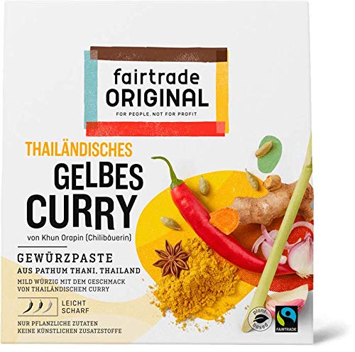 Fairtrade Thai curry paste. Thai yellow curry paste 70g. This yellow curry paste is particularly suitable for preparing Asian Thai dishes, especially curries. The paste is slightly milder and also suitable for those who prefer a less spicy flavor. This curry spice paste is aromatic and delicate thanks to the intense flavor of yellow chili. It is made exclusively from plant-based ingredients and without artificial additives. Fairtrade Original Thai curry is made in Thailand and freshly packed in Bangkok by KRS Spicy Food. This allows more people to enjoy Fairtrade recipes. For individuals. Not suitable for professional use. Fairtrade product. Pioneers since 1959. Our profits mean a better life for the people we work with. Together? Yes, truly together. We visit them regularly and share our knowledge. We know the taste of here, the ingredients, and the recipes. That's what makes us the Original. As the world's first Fairtrade organization and the only non-profit brand in the Dutch food trade, we work closely with farmers and producers in Africa, Asia, and Latin America. We do this with one mission: by developing local distribution chains, we want to make Fairtrade food and drinks accessible to everyone. INGREDIENTS Rice oil, garlic, shallots, lemongrass, curry (coriander, turmeric, cumin, cloves, star anise, ginger, cinnamon, cornflour, cardamom, nutmeg), red chili, salt, coriander, galganat, turmeric, ginger, pepper, lime, cumin. All garlic, shallots, lemongrass, red chili, galganat, turmeric, and ginger are processed according to Fairtrade standards. Total content: 38 INSTRUCTIONS FOR USE Simply mix 1:1 with 400ml coconut milk for a mild Thai curry. For a spicier curry, use 270ml coconut milk. See moreFairtrade Original Pâte à curry jaune Thaïlande - 70 g - Pâte à curry thaïlandaise - Sans additifs artificiels - Pour plats asiatiques et épicés - Pour plats tranchantsDESCRIPTION DU PRODUIT DESCRIPTION DU PRODUIT Pâte à curry thaïlandaise issue du commerce équitable. Pâte à curry jaune thaïlandaise 70 g. Cette pâte curry jaune est particulièrement adaptée pour la préparation de plats asiatiques thaïlandais, en particulier pour les currys. La pâte est un peu plus douce et convient également pour tous ceux qui veulent la moins tranchante. Cette pâte à épices Curry est aromatique et fine grâce au goût intense du piment jaune. Il est fabriqué exclusivement à partir d'ingrédients végétaux et sans additifs artificiels. Le curry thaï de Fairtrade Original est fabriqué en Thaïlande et est fraîchement emballé à Bangkok chez KRS Spicy Food. Ainsi, plus de personnes ont la chance de profiter des recettes supplémentaires du commerce équitable. Pour People. Ne convient pas pour les professionnels. Produit issu du commerce équitable. pionniers depuis 1959. Notre gain signifie une vie meilleure pour les personnes avec lesquelles nous travaillons ensemble. En commun ? Oui, vraiment ensemble. Nous les visitons régulièrement et échangeons nos connaissances mutuelles. Nous connaissons le goût d'ici, les ingrédients et les recettes. Cela nous rend le Original. En tant que première organisation du commerce équitable au monde et seule marque non profitable dans le commerce alimentaire néerlandais, nous travaillons en étroite collaboration avec les agriculteurs et les producteurs d'Afrique, d'Asie et d'Amérique latine. C'est ce que nous faisons avec une mission : en développant des chaînes de distribution locale, nous voulons rendre les aliments et boissons équitables accessibles à tous. INGRÉDIENTS huile de riz, ail, échalottes, citronnelle, curry (coriandre, curcuma, cumin, clou de girofle, anis étoilé, gingembre, cannelle, fleur de maïs, cardamome, noix de muscade), piment rouge, sel, coriandre, galgant, curcuma, gingembre, poivre, citron vert, cumin. Tous les ails, les éphalottes, la citronnelle, les piments rouges, le galgant, le curcuma et le gingembre sont traités conformément aux conditions du commerce équitable. Teneur totale : 38 MODE D'EMPLOI Mélangez simplement 1:1 avec du lait de coco de 400 ml pour un curry thaï doux. Pour un curry plus épicé, utilisez du lait de coco de 270 ml. Voir plus