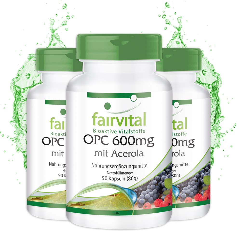 ✓ MONEY BACK GUARANTEE: 24 MONTHS for merchant shipping orders. ✓ MICROPURITY Made in Germany: according to HACCP. Origin of raw materials from EU and non-EU countries. ✓ 6 MONTH SUPPLY: Long shelf life in an airtight container. 270 grape seed extract capsules - higher efficiency than powder and liquid! In a light package with a practical DOSING COVER!. ✓ BIO-Available WITHOUT: Gluten, lactose, magnesium stearate, preservatives, soy, yeast, pesticides, fungicides, fertilizers, dyes, stabilizers and genetic engineering (NON-GMO). VEGANE OPC capsules without animal ingredients!. ✓ Fairvital GERMAN QUALITY: Daily dose: 1 capsule per day contains 630mg grape seed extract, of which 600mg OPC, 100mg acerola powder, of which 25mg vitamin C. Highly dosed! Excellent value for money!.Fairvital OPC 600mg capsules met acerola - HOOG GEDOSEERD - VEGAN - 270 capsules (90 x 3) - druivenpit extract voedingssupplement✓ GELD-TERUG-GARANTIE: 24 MAANDEN voor bestellingen met verzending door handelaars. ✓ MICROPURITY Gemaakt in Duitsland: volgens HACCP. Herkomst van grondstoffen uit EU- en niet-EU-landen. ✓ 6 MAAND VOORRAAD: Lange houdbaarheid in een luchtdicht afgesloten verpakking. 270 druivenpit extract capsules - hogere efficiëntie dan poeder en vloeistof! In een lichte verpakking met een praktische DOSEERDEKSEL!. ✓ BIO-Beschikbaar ZONDER: Gluten, lactose, magnesiumstearaat, conserveermiddelen, soja, gist, pesticiden, fungiciden, kunstmeststoffen, kleurstoffen, stabilisatoren en gentechnologie (NON- GMO). VEGANE OPC capsules zonder dierlijke ingrediënten!. ✓ Fairvital DUITSE KWALITEIT: Dagelijkse dosis: 1 capsule per dag bevat 630mg druivenpitextract, waarvan 600mg OPC, 100mg acerolapoeder, waarvan 25mg vitamine C. Hoog gedoseerd! Uitstekende prijs-kwaliteitsverhouding!.