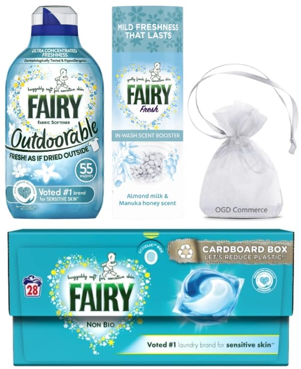 Discover the gentle care of Fairy Non Bio Pods Washing Liquid Capsules, with the best softness Fairy Non Bio has to offer. All Fairy Non Bio Pods are in a pack with a Child Lock System, to keep them safe from children. Fairy Non Bio Pods gently clean and wrap your family's delicate skin in huggable softness. Dermatologically tested, the Fairy Non Bio range has been awarded the Skin Health Alliance seal. Independent tests have confirmed that clothes washed in Fairy are as kind next to skin as clothes washed in water alone. Additionally, they include a special ingredient that will provide delightful softness to your clothes and so they will feel extra gentle on your skin. Unlike washing powder or liquids, Fairy Non Bio pods have a unique multi-compartment design to ensure that each ingredient is released into the wash at the right time.*** Voted #1 Fabric Conditioner brand for sensitive skin. Fairy believe that the most delicate skin deserves the best and that's why Fairy Outdoorable Fabric Conditioner is hypoallergenic and dermatologically tested, wrapping your family’s delicate skin in huggable softness. Enjoy freshness as if you’ve dried your clothes outside, even when you dry inside! Thanks to its innovative technology, you just need a small dose to get that line dried feeling, whatever the weather! *** Add Fairy Fresh In Wash Scent Booster Beads to your laundry for mild freshness that lasts and lasts. From the brand voted #1 for sensitive skin (online panel of 3327 females among which Fairy Non Bio was voted most often as the #1 detergent & fabric softener for sensitive skin.). Dermatologically tested in-wash scent booster. Fairy Beads fresh cardboard with 0% Dyes. Can be added to every load with all types of fabrics.. Add Fairy in-wash scent booster to your laundry for mild freshness that lasts and lasts. Fairy in-wash scent booster comes in a moisture resistant, recyclable CARDBOARD PACK. INGREDIENTS >30% Anionic Surfactants, 5-15% Soap, <5% Non-Ionic Surfactants, Phosphonates, Polycarboxylates, Optical Brighteners, Perfumes *** >30% Anionic Surfactants, 5-15% Soap, <5% Non-Ionic Surfactants, Phosphonates, Polycarboxylates, Optical Brighteners, Perfumes + + 5-15% Cationic Surfactants, Perfumes *** Perfumes, Alpha-Isomethyl Ionone, Citronellol, Hexyl Cinnamal, Hydroxyisohexyl 3-Cyclohexene Carboxaldehyde, Limonene, Linalool DIRECTIONS READ BEFORE USE THE LABELS. Handle with dry hands, Add capsule to the back of the drum, Add clothes, Close package after use. *** After adding your favorite detergent, measure the amount of softener for the size of your load using the cap provided. Add Fairy Outdoorable fabric conditioner into your washing machine's dispenser drawer.*** Pour beads directly into the empty drum before your laundry. Personalize the scent intensity by choosing the quantity of beads you want to use. SAFETY WARNING READ BEFORE USE THE LABELS, WARNING AND INSTRUCTION PROVIDED WITH THE PRODUCT. May produce an allergic reaction. Keep out of reach of children. Causes serious eye damage. Harmful to aquatic life with long lasting effects. IF IN EYES: Rinse cautiously with water for several minutes. IF ON SKIN: Wash with plenty of water. IF SWALLOWED: Rinse mouth. Do NOT induce vomiting. Immediately call a POISON CENTER/doctor. Never soak or wash above 50 °C. Keep away from sunlight and heating more than 30°C. See moreAdd Fairy Fresh in-wash scent booster to your laundry for mild freshness that lasts and lasts. This scent booster is dermatologically tested & endorsed by the Skin Health Alliance. Fairy Outdoorable with rich creamy peachy notes, floral touches, and a crisp, pure scent of fabrics dried outside in the sun–a perfect reassurance of Fairy of care and clean for your clothes!. Fairy Outdoorable was developed together with consumers to recreate the outdoor freshness and it keeps releg freshness when fabrics are just dried, stored in the cupboard and even when you’re moving. Discover the gentle care of Fairy Non Bio Pods, with Fairy best softness (vs other Fairy Non Bio detergents) Fairy Non Bio Pods gently clean and wrap your family's delicate skin in huggable softness. Bundle Pack *** Our Gift For You - Organza bag. Using 9 x 7 x 0.1 cm mini bag are made of special sheer organza, which are very durable, touch softly and smoothly. You can store your tiny items whilst celebrating festivals like wedding, Christmas, graduation, and party.