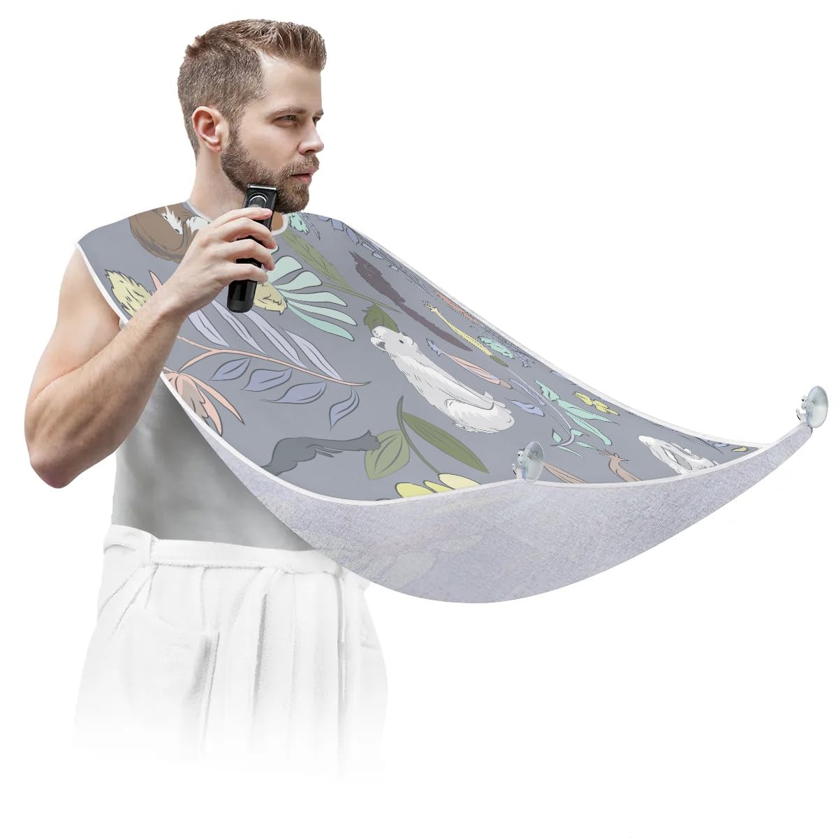 fiber fabric, ensuring exceptional quality. The fabric has a smooth and soft surface that is not sticky to hair, making it comfortable to wear during grooming sessions. It is also waterproof and anti-static, further enhancing its practicality. In addition, it is equipped with two high-quality suction hooks that provide powerful suction without leaving marks on mirrors or tiles. ?Convenient and Easy to Use?: Using our beard hair catcher is a breeze. Just fasten it around your neck using the adjustable strap and secure it to the mirror. Once in place, you can effortlessly proceed with your regular grooming routine. When you're done, simply remove the beard bib from the suction cups. Then brush the collected hair into the trash can for easy cleanup. ?Effortless Hair Cleanup?: Our Fall Bear Fox Bunny beard bib is expertly designed to capture all loose beard hair, mustache, and sideburn trimmings, providing effortless cleanup and keeping your sink immaculately clean. This saves you valuable time that would otherwise be spent on tedious cleaning tasks. Not only does it serve a practical function, but it also adds a stylish touch to your daily grooming routine.
