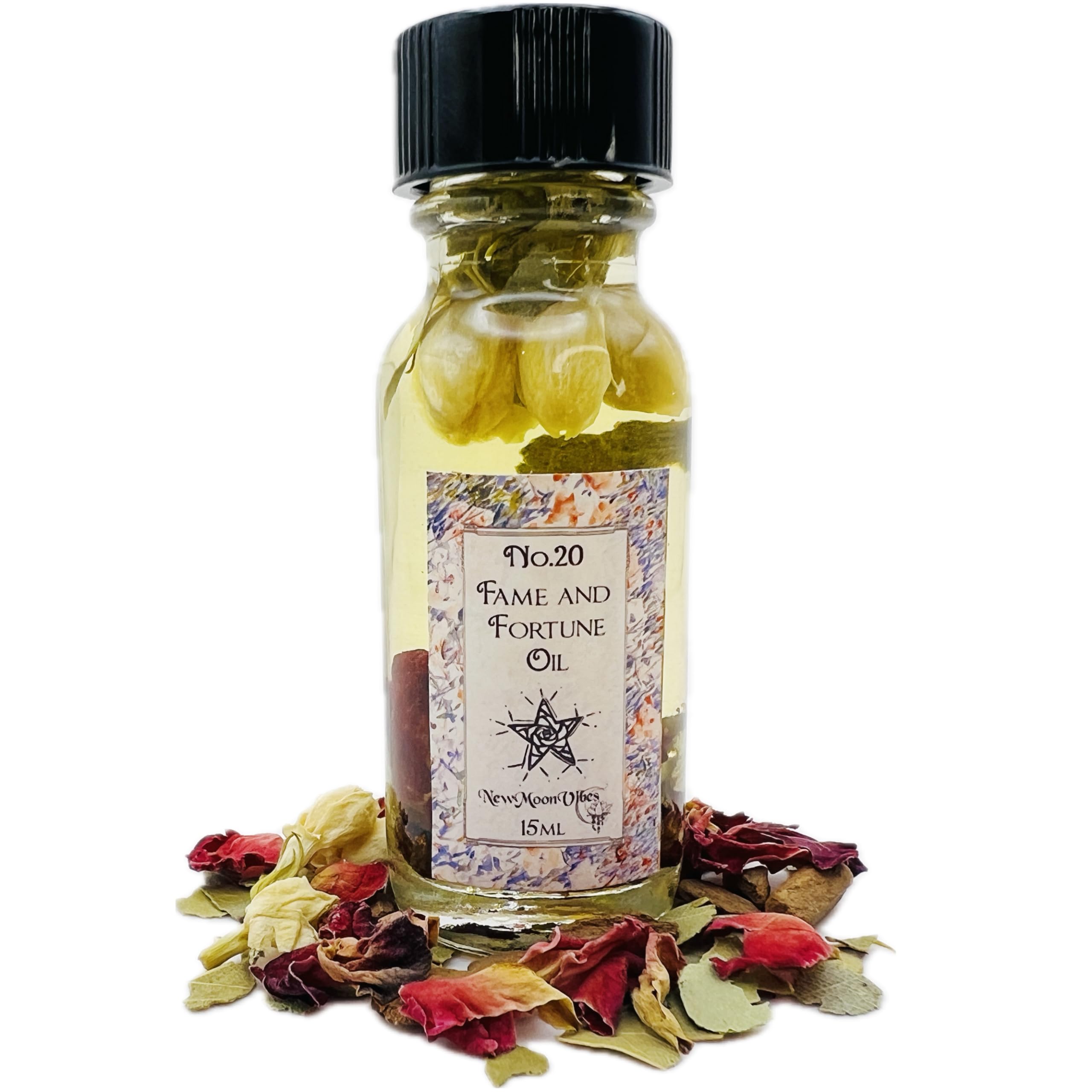 Unveil the secrets to wealth and recognition with our exclusive Fame and Fortune Oil, a carefully concocted elixir designed to elevate your spiritual practice. Each bottle contains a powerful blend of Rose, Jasmine, Cinnamon, and Bay Leaves, ingredients renowned for their association with attracting prosperity and acclaim. Crafted with intent, this oil is your ally in the quest for success. Rose: A symbol of love and admiration, rose petals are believed to open doors to the heart, drawing in admiration and respect from those around you. Jasmine: Revered for its connection to the moon and its seductive scent, jasmine is said to enhance your intuition and attract spiritual love, helping you form meaningful connections on your journey to fame. Cinnamon: Known for its fast-acting properties in spells, cinnamon is a powerhouse for drawing quick success, heating up your endeavors for rapid achievement. Bay Leaves: A staple for manifestation, bay leaves are believed to grant wishes, providing protection and strength, ensuring your path to fortune is clear and unobstructed. Presented in a 1 2 oz glass bottle, this oil is not just a tool but a treasure, ready to be integrated into your daily rituals and practices. Here are five creative ways to harness its magic: 1. Anointing Objects: Dab a small amount on items that symbolize your goals, such as business cards, resumes, or workstations, to attract success and recognition. 2. Diffuser Addition: Add a few drops to your diffuser to fill your space with the aroma of success, setting the stage for prosperity and fame. 3. Personal Talismans: Anoint crystals or talismans that align with your aspirations, turning them into powerful magnets for your desired outcomes. 4. Financial Documents: Lightly brush over financial statements or investment plans to bless your endeavors with growth and abundance. 5. Vision Boards: Apply a drop on images or symbols on your vision board to energetically charge your dreams, making them a magnet for success. Affirmation for Success: As you use this oil, recite the affirmation, "I attract fame and fortune effortlessly, my actions lead me to abundant success." Best recited during the new moon, a time for setting intentions and manifesting dreams. Sold as a Curio: This product is intended for external use only and sold as a curio. It is a spiritual tool to enhance your practices, not a guarantee of outcomes. Always use with positive intention and belief in your own power to manifest your desires. Embark on your journey to success with our Fame and Fortune Oil, a companion in your ritualistic practices, designed to weave the fabric of your desires into the tapestry of reality.New Moon Vibes handcrafted creation made to enhance your intentions. Infused with Real Herbs and Essential Oils. These oils enhance manifestation and intuition, magnifying intentions while nurturing a profound bond with nature and the spiritual realm. They enrich meditation, deepening one's connection to the divine. -Rose is celebrated for its unparalleled ability to attract love, fostering deep emotional connections and facilitating heart-centered healing. -Jasmine emits a divine fragrance believed to draw spiritual love and assistance, bridging the celestial and the terrestrial realms. -Calendula offers protection against negative energies and supports prophetic dreams, while also aiding in legal matters and enhancing psychic abilities. -Lavender is a beacon of tranquility, purifying the environment and soothing the spirit to promote inner peace and a harmonious balance. Our Fame and Fortune Oil is meticulously formulated upon request, guaranteeing the freshness and effectiveness of every component for your spiritual endeavors. It's not just a mix of essential oils and authentic herbs it's also imbued with positive affirmations and blessings. This carefully crafted concoction is designed to amplify your path to achieving recognition and wealth, with its powerful, energetic essence.