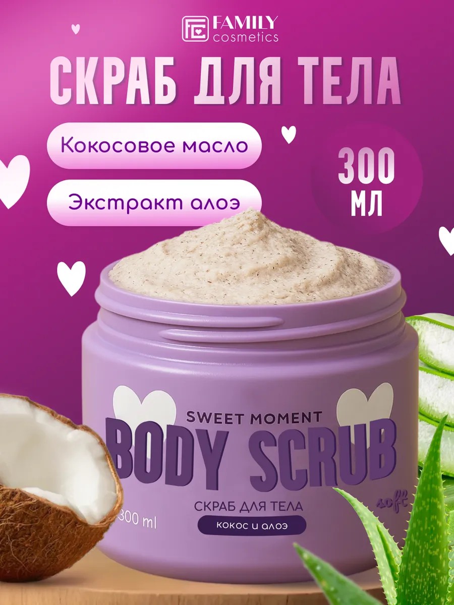 Отшелушивающий скраб для тела и рук Кокос и Алоэ от Family Cosmetics бережно удаляет омертвевшие клетки и обновляет кожу, делает её мягкой, гладкой и упругой. Профессиональный скраб на основе натуральных абразивных частиц нежно полирует кожу, избавляя от растяжек, целлюлита и шелушений. Формула включает в себя питательные масла, экстракты и пантенол, благодаря которым средство не пересушивает кожу и придает здоровое сияние после душа. Антицеллюлитный скраб с маслами оказывает лимфодренажный эффект, за счёт которого кожа становится более упругой, а целюлит постепенно уходит. Наш скраб против целлюлита тонизирует, выравнивает рельеф кожи и предотвращает появление растяжек на коже и целлюлит. Регулярный механический пилинг в уходе за телом также избавляет от шрамов, пигментных пятен и вросших волос.