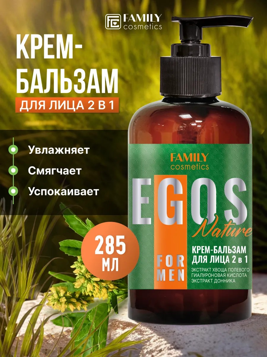 Крем-бальзам для лица 2 в 1 Nature серии EGOS for men с гиалуроновой кислотой, экстрактами донника и хвоща полевого увлажняет, успокаивает и смягчает кожу. Легкая формула крема-бальзама с увлажняющими компонентами помогает устранить ощущения стянутости и сухости, способствует уменьшению покраснений и микроповреждений кожи. Крем после бритья мужской идеально подходит для ежедневного применения. Разработанный с учетом особенностей мужской кожи, крем подходит для всех типов кожи. Используйте бальзам в качестве дополнительного увлажнения после бритья. Легкая увлажняющая текстура быстро впитывается, не оставляя липкости на коже.