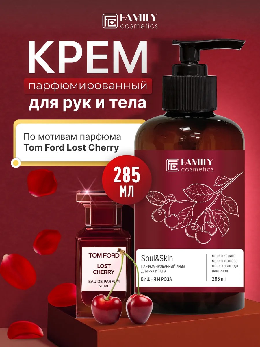 The Cherry and Rose Perfumed Hand and Body Cream from the SOUL&SKIN line offers a seductive scent, an irresistible melt-in texture, and impeccable care. Inspired by the best-selling Tom Ford Lost Cherry fragrance, luxurious moisturizing ingredients hydrate the skin of your hands and body, leaving it feeling smooth and silky. Shea butter, jojoba, avocado, and panthenol provide balanced nourishment, protect against flaking and dryness, and restore vitality.