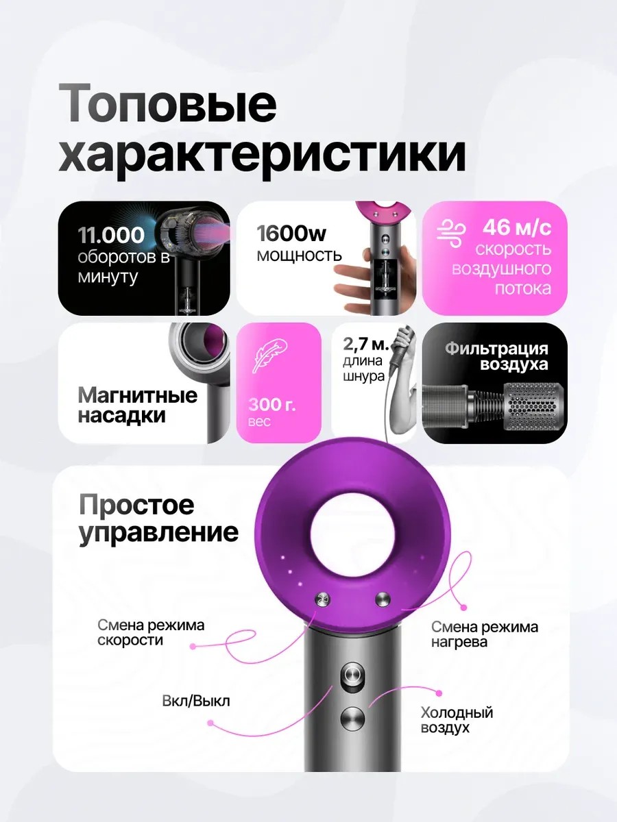 Профессиональный многофункциональный фен для волос 2400 5 в 1 – лучшее устройство для ухода за волосами, бытовая техника для мужчин и женщин. Благодаря трем режимам работы (холодный, теплый, горячий), быстрая сушка и укладка волос не составит труда. Набор имеет 5 магнитных насадок, три режима мощности, четыре температуры, защиту от перегрева, обдув холодным воздухом, ионизацию и турборежим. Модель в расцветках - розовой, фиолетовой, красной, синей, серой. Фен обеспечивает бесшумный, безопасный и здоровый уход за волосами любого типа: короткими, длинными, кудрявыми, прямыми, пушистыми и непослушными. Универсальный проводной фен с пятью насадками для здоровой сушки волос и создает их прикорневой объем. Придает объём причёске, создать небрежные или крупные локоны, выпрямить пряди, сделать завивку. Стайлер с нескользящей ручкой в качестве выпрямителя и завивки кончиков с помощью крутящейся круглой расчески - щетки. Дополнительную защиту волос дает ионизатор, воздушный поток не оказывает негативного воздействия на волосы. Формирование кудрей доступно благодаря диффузору для создания прикорневого объема. Многофункциональный мультистайлер для создание разных причесок станет альтернативой аналогу дайсон (dyson) реплики, длина шнура 2.70 м. Строгое каре с прикорневым объемом, гладкая волна безупречно прямых послушных волос, локоны разного размера с мокрым эффектом, ирокезы, челка в корейском стиле, разглаживание прядей, распутывание волос и накручивание обычных кудряшек – обладательнице стайлера доступно создание любого образа. Подходит для домашнего и профессионального ухода за секущимися волосами различной густоты и длины. Мощный профессиональный автоматический и компактный фен мини с щипцами с керамическим покрытием, функцией термозащиты можно использовать дома, в салонах красоты, в обычных парикмахерский – отличный подарок для любимой девушки, жены, мамы, дочери, на день рождения, юбилей, свадьбу. У нас есть акции и распродажи купите наши товары в подарок со скидкой!