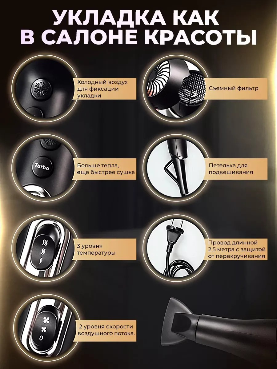 Мощный профессиональный фен BONWER - идеальный выбор для создания причесок от вьющихся кудрей до гладких локонов. В комплекте с ним прилагаются сменные насадки (2 штуки): узкий концентратор и гребень. Они придают объем у корней и помогут сделать красивую укладку. Черный прибор высокого качества прост в работе, обеспечивает быструю сушку женских и мужских волос, благодаря мощности 2000 - 2400 Вт. Компактный и легкий, с эргономичной ручкой, он поставляется в красивой подарочной упаковке. Есть кнопка быстрой подачи холодного воздуха и разные температурные режимы. Мощный девайс с удобным шнуром для сети питания с защитой от перекручивания - супер - устройство для создания разных причесок дома. Он подойдет для парикмахерской, салона красоты и дорожных условий. Стайлер для женщин, мужчин и девочек легко обрабатывает длинные и короткие, прямые и волнистые прядки, челку. Электрический прибор с регулировкой скорости потока воздуха - хорошее средство для сушки разных типов мокрых локонов, в том числе поврежденных. На нем предусмотрена петелька для настенного хранения в квартире. Разнообразьте образ и создайте эффектную прическу за несколько минут с портативной бытовой техникой. Изделие с кабелем длиной 3 м удобно брать в бассейн, гостиницу и в дорогу. Вы экономите время, когда надо сделать взрослую и детскую укладку или накручивание кудряшек дома. Стайлер в наборе с насадками (2 штучки) обеспечит уход за длинными и короткими, густыми и тонкими прядями на голове, заботясь об их здоровье. Приспособление с держателем идеально для формирования прикорневого объема, сушки пушистых и секущихся, волнистых и кудрявых непослушных прядей в домашних условиях. Он требует минимальных усилий, в отличие от обычных стайлеров, для завивки средних и крупных кудряшек. Ручной фен с длинным проводом - хороший подарок! У нас есть акции и распродажи, вы можете купить наши товары в подарок на 14 и 23 февраля со скидкой!