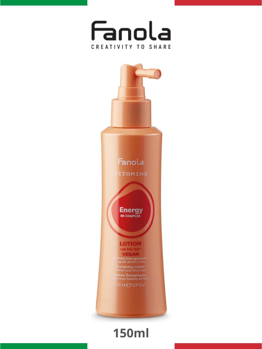 Fanola Vitamins Energy Lotion strengthens hair and cleanses and stimulates the scalp. Contains active ingredients that improve blood flow to the hair follicle, adding tone and vitality. Ideal for weak and thin hair. Enriched with vitamins B and E (BE complex) - an innovative complex that can effectively combat scalp problems, including hair loss. Nettle and rosemary extracts tone and treat the scalp, prevent hair loss and stimulate hair growth. Nettle has disinfectant properties and also has a beneficial effect on tissue cells, restores the structure of the hair follicle, activates follicles and stimulates growth. Rosemary extract has an invigorating stimulating effect, improves blood circulation, promoting active hair growth and increasing hair tone. Has a vegan formula • pH 5.0 / 5.5