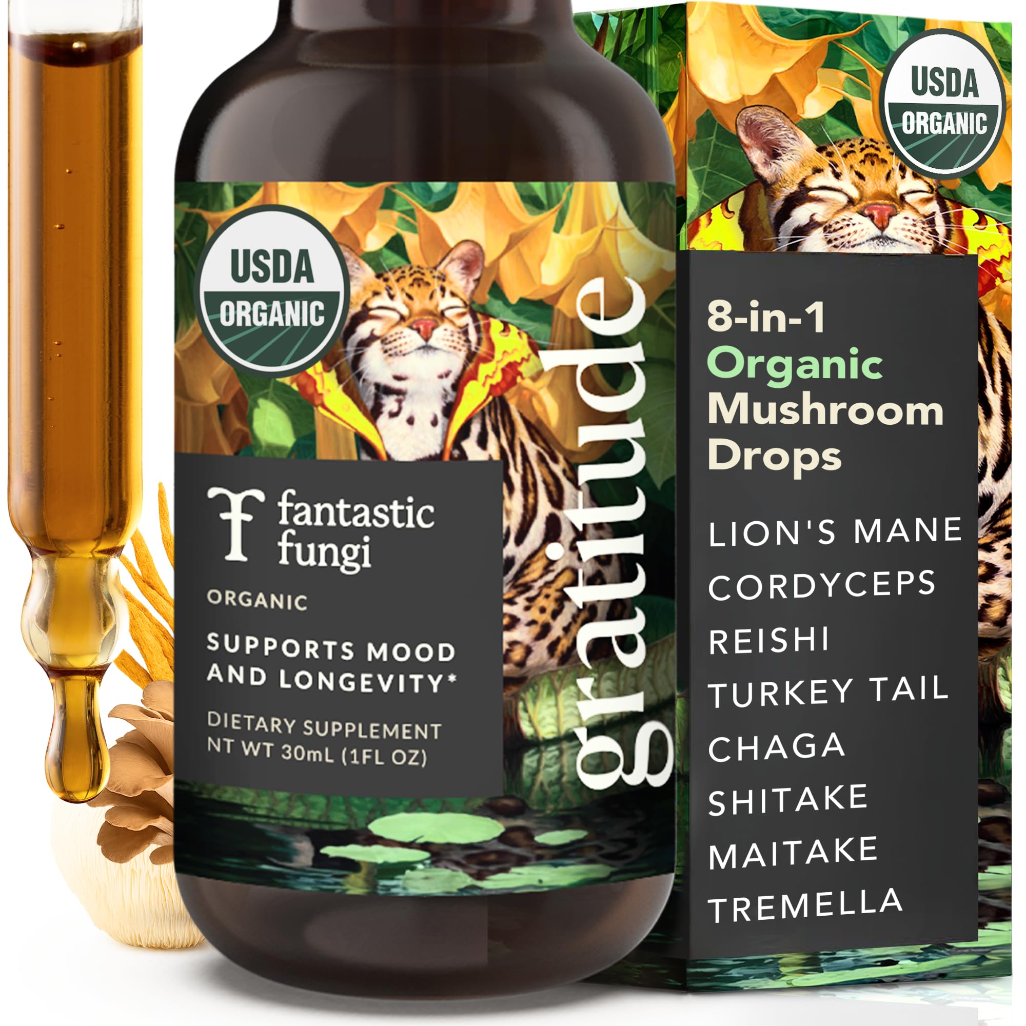 Fantastic Fungi Mushroom Extract - 8-in-1 Organic Complex Mushroom Supplement with Cordyceps Reishi Lion s Mane Chaga Turkey Tail Shiitake Maitake & Tremella - Adaptogen Liquid Tincture 1 fl oz Gratitude