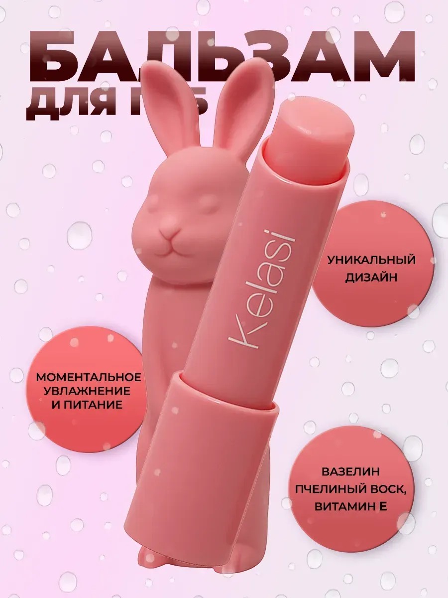 Увлажняющий бальзам для губ Kelasi в оригинальной упаковке в виде милого зайчика — это не просто уход, а настоящий cute бальзам, который приятно держать в руках и дарить близким. Благодаря натуральным компонентам — вазелину, пчелиному воску, витамину E и глицерину — он эффективно питает и защищает губы от сухости и обветривания. Прекрасно справляется с трещинками, делая губы мягкими, гладкими и ухоженными. Этот питательный бальзам подходит для ежедневного использования, особенно в холодное время года. Компактный формат удобно брать с собой в сумочке или косметичке. Идеально подойдёт как подарок девушке, особенно тем, кто любит необычные и милые косметические средства. Гигиеническая помада Kelasi — выбор тех, кто ценит не только качество, но и эстетичный дизайн. Добавьте в свою коллекцию стильный и функциональный бальзам зайчик, который подарит вашим губам комфорт и заботу.Бальзам для губ — это гигиеническая, ухаживающая и защитная помада для ухода и смягчения кожи губ. Лечебная формула обеспечивает интенсивное увлажнение, а оттеночный и тонирующий варианты придают лёгкий цвет. Наши продукты, средства и lip-продукты — это качественная косметика для ухода и макияжа, идеальные товары для ухода за губами. Выбирайте гигиеничку или бальзам для губ с оттенком нежности для ежедневной заботы и красоты.