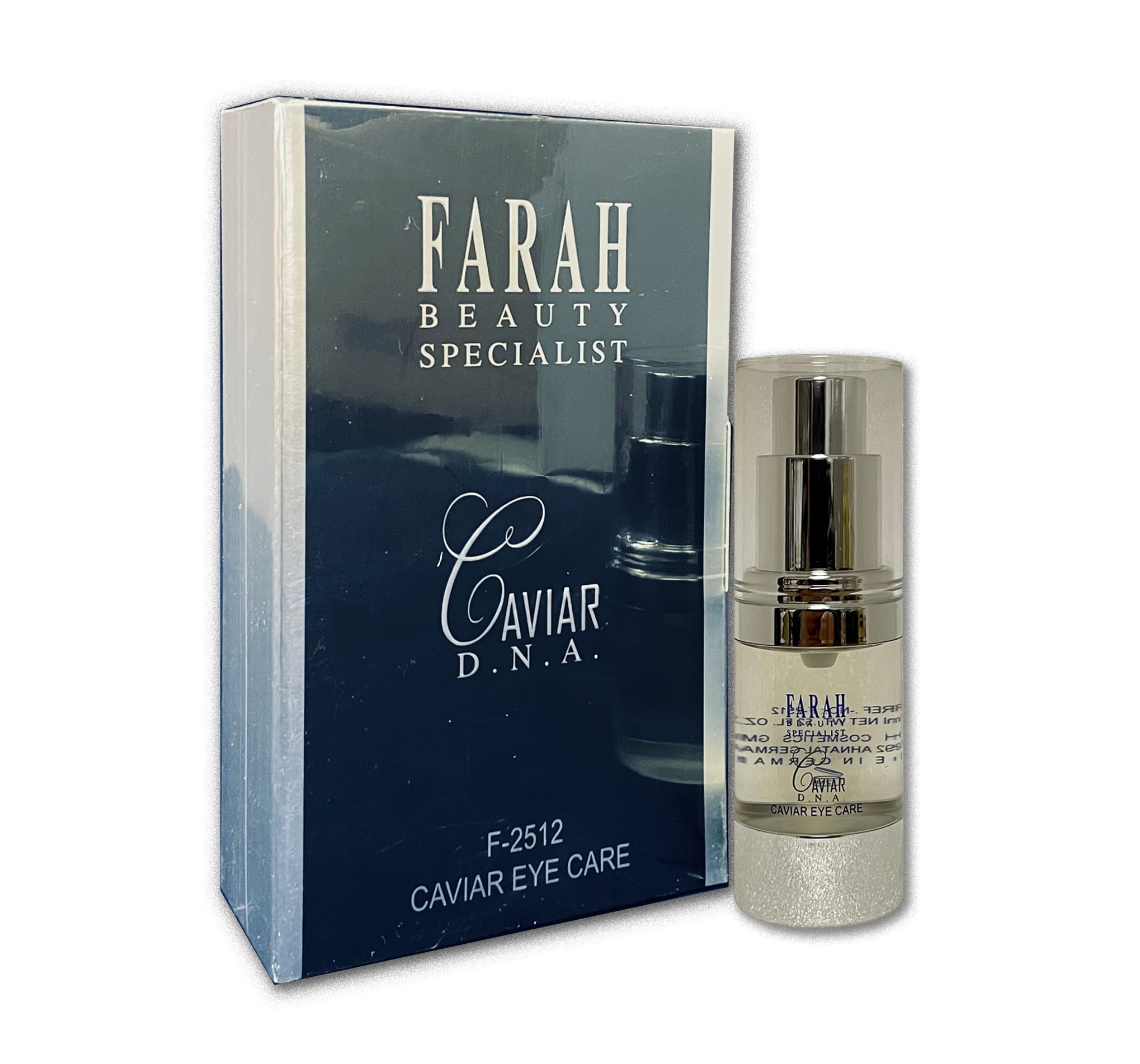 FARAH DNA Eye Care F-2512 (15ml) The Caviar DNA Eye Care helps the skin to fight against any tendency to show signs of aging. Natural biopeptides and active agents of the caviar power chain, when selectively applied, allows the eyes in particular to appear young and refreshed. - Active Ingredients: Sea D.N.A, Palmitoyl Oligopeptides, Moist 24, Vitamin B5, Chondroitin, Hyaluronic Acid, Licorice Extract and Vitamin A. - Applications: Pat eye care gently on the skin. Apply in the morning and in the evening - Suitable for normal, dry, and mature skin types. F-2512 (15ml)