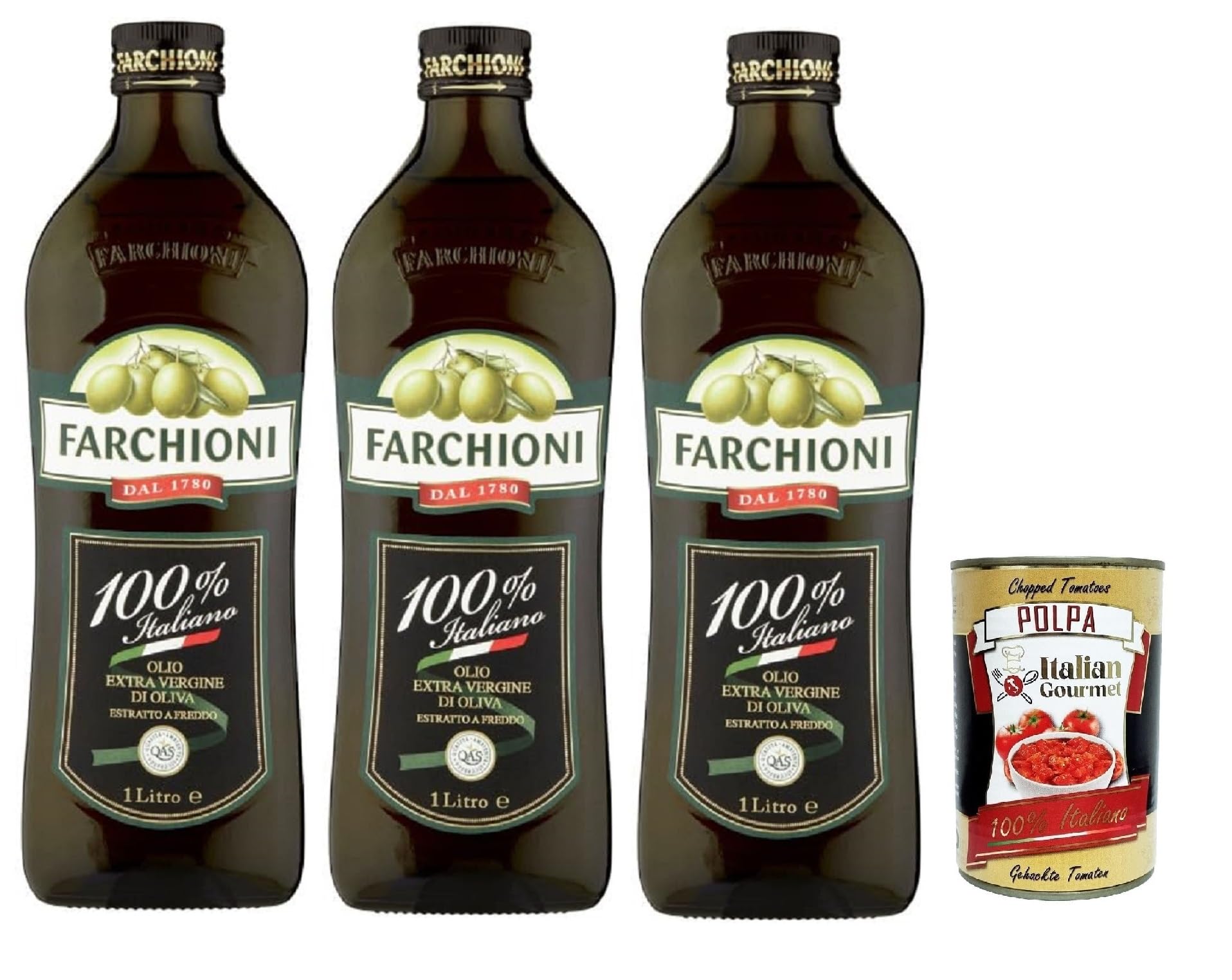 Farchioni Extra Virgin Olive Oil 100 Italiano 1 liter 3pack with Italian Gourmet Polpa 400g