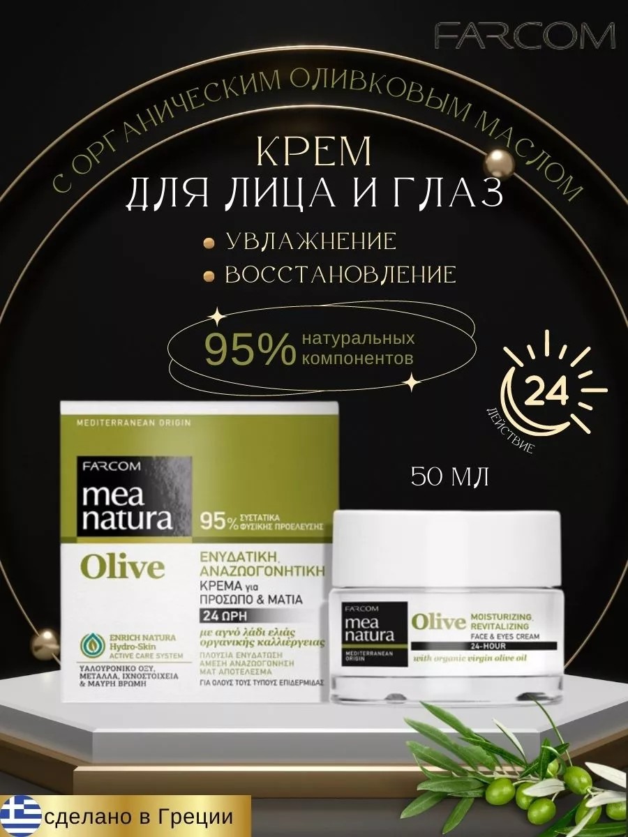 Увлажняющий и восстанавливающий крем для лица и кожи вокруг глаз 24-часового действия Farcom MEA NATURA обогащен органическим оливковым маслом первого отжима, известным своими антиоксидантными свойствами, и активным комплексом ENRICH NATURA Hydro–Skin, богатым ингредиентами растительного происхождения. Благодаря такому эффективному сочетанию крем интенсивно увлажняет и питает кожу.