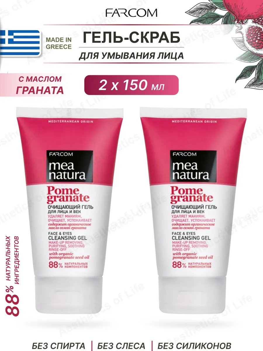 MEA NATURA Pomegranate Cleansing Gel for Face and Eyes with Pomegranate Oil, Greece, 150 ml. Mea Natura daily cleansing gel for face and eyes. Contains a natural complex of organic pomegranate seed oil, biosaccharides, plant extracts and citrus extracts, provides protection against free radicals, and tones and refreshes the skin. Effectively removes makeup and impurities. Gently cleanses without overdrying the skin. Instantly revitalizes the skin, helping to maintain its natural moisture balance, makes the skin smooth and radiant. Suitable for removing waterproof makeup. Does not cause irritation. Suitable for all skin types. **DIRECTION** Gently apply to a damp face. Lightly massage your face for 2-3 minutes until foam forms. Rinse with plenty of warm water. FARCOM is one of the largest companies in the cosmetics industry with over 50 years of history. 100% made in Greece.