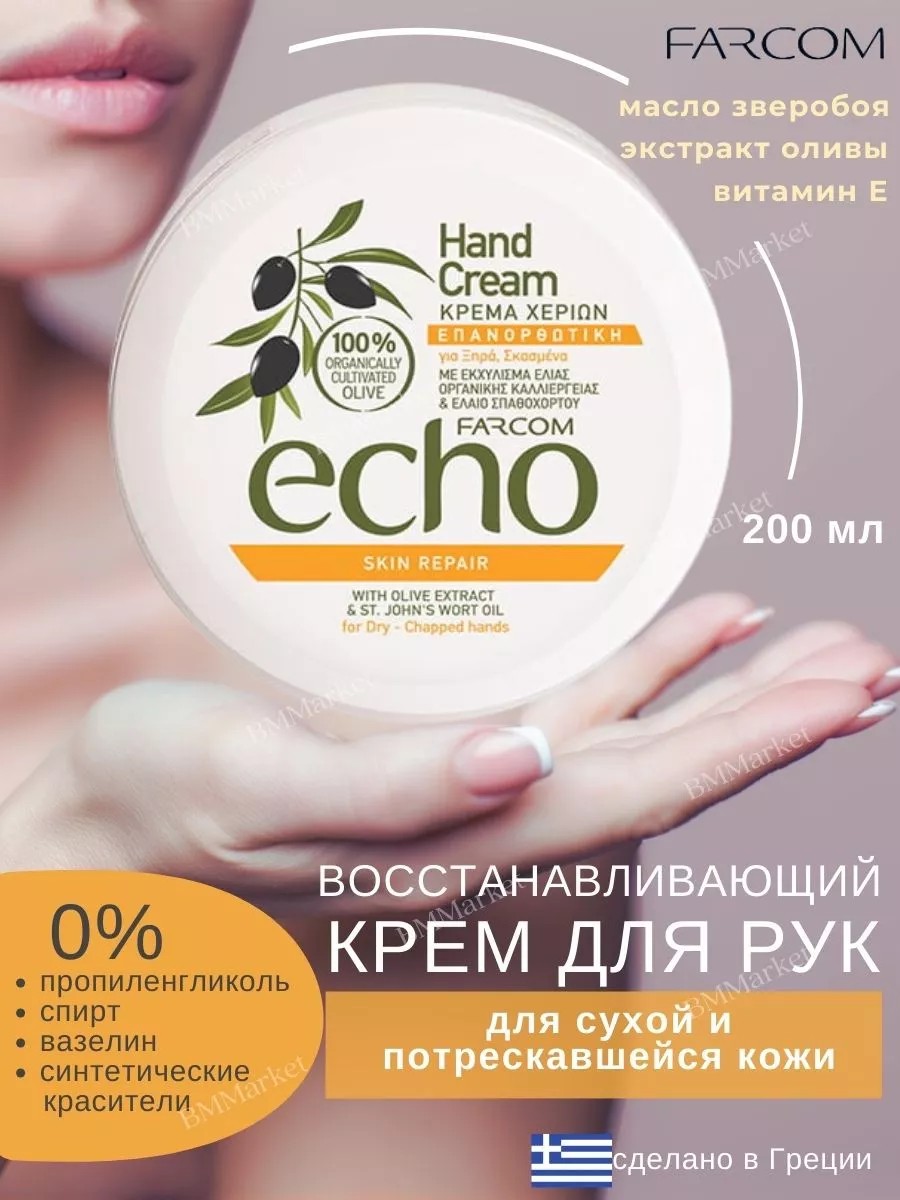 Восстанавливающий крем для рук мужской женский ECHO SKIN REPAIR Farcom (Греция) содержит натуральные увлажняющие, успокаивающие и антиоксидантные ингредиенты, которые обеспечивают глубокое увлажнение кожи и избавляют от сухости и от трещин. Насыщенная, нежирная текстура, легко распределяется и быстро впитывается. Средство для ухода за руками не содержит пропиленгликоля, вазелина, а также спирта и синтетических красителей. Крем для рук увлажняющий питательный рекомендован для ежедневного использования для очень сухой и потрескавшейся кожи рук. Крем с натуральным экстрактом оливы, алоэ вера, зверобоя и витамином Е дерматологически протестирован. Активные ингредиенты: экстракт алоэ глубоко увлажняет; экстракты зверобоя и календулы обладают противовоспалительными и восстанавливающими свойствами; оливковое масло питает сухую кожу рук. Эффект от использования – увлажненные бархатные ручки без трещен. Крем для рук зимний, весенний, осенний и летний вариант защиты ваших рук и ногтей. Это бьюти средство обязательно должно быть в составе набора по уходу за телом.