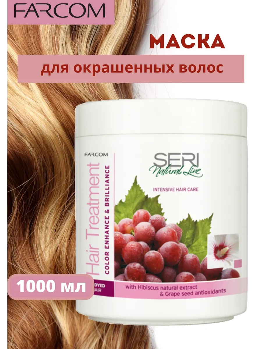 Farcom Professional Seri Natural Line Color-Treated Hair Mask with Hibiscus and Grape Extracts for Color Restoration and Shine, 1000 ml. A professional protective mask for colored and chemically treated hair. Intensive hair restoration with hibiscus extract, rich in fruit acids, as well as moisturizing ingredients and antioxidants contained in grape seeds, which act as a protective shield against the negative impact of the environment. Natural ingredients protect color, restoring shine and a healthy appearance to hair. Nourishes and moisturizes hair, making combing easier. Stabilizes and preserves color and helps restore damaged hair.