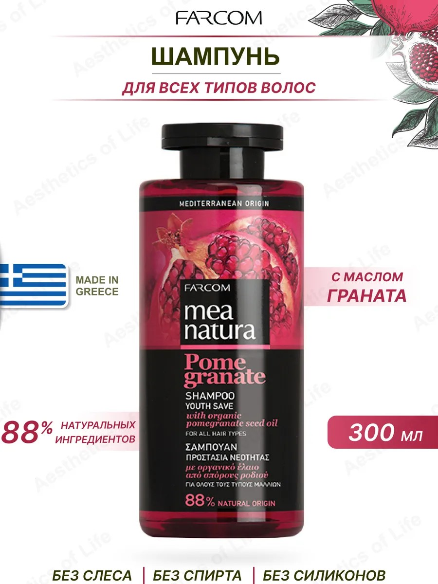 Шампунь с маслом граната для всех типов волос 300 мл. для сохранения молодости волос, с органическим маслом гранатовых косточек, полисахаридами и льняным маслом. Эта натуральная смесь богата полифенолами, дубильными веществами, Омега-3 жирными кислотами и витаминами - основными компонетами для здорового роста волос.Благодаря антиоксидантному действию, шампунь Mea natura Pomegranate обеспечивает защиту от внешних факторов, таких как свободные радикалы, воздействие солнечных лучей, стайлинга и ежедневного расчесывания, которые являются основными причинами преждевременного старения. Он оздоравливает волосы, оставляя их гладкими, шелковистыми и наполненными силой. Воздействует на кожу головы мягко, не вызывая раздражения. **СПОСОБ ПРИМЕНЕНИЯ** Нанести на влажные волосы и нежно помассировать голову до образования пены. Тщательно промыть волосы водой и при необходимости повторить. Избегать контакта с глазами.