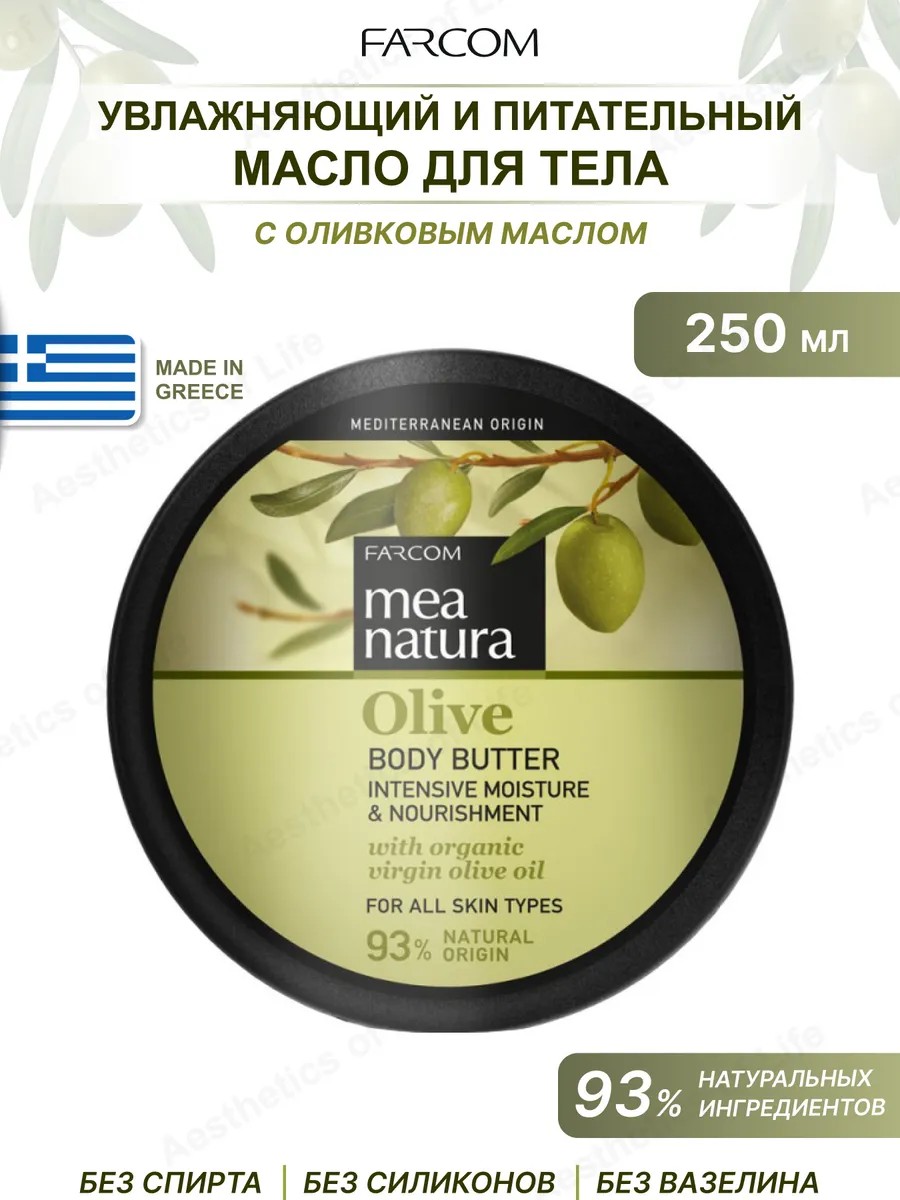 Moisturizing and nourishing body cream-butter with olive oil MEA NATURA Olive, Greece, 250 ml. Intensively moisturizing body cream-butter with organic olive oil, vitamin E and beeswax, a natural blend of ingredients with antioxidant and moisturizing properties to give softness and effectively protect the skin. Body butter Mea natura Olive nourishes and immediately restores the skin, improves its elasticity, giving it unrivaled softness and smoothness. Its rich texture is instantly absorbed without leaving an oily finish. Suitable for all skin types, as well as dry skin with increased hydration needs. **DIY** After showering, apply a small amount of cream to the body and gently massage. Leave on until absorbed.