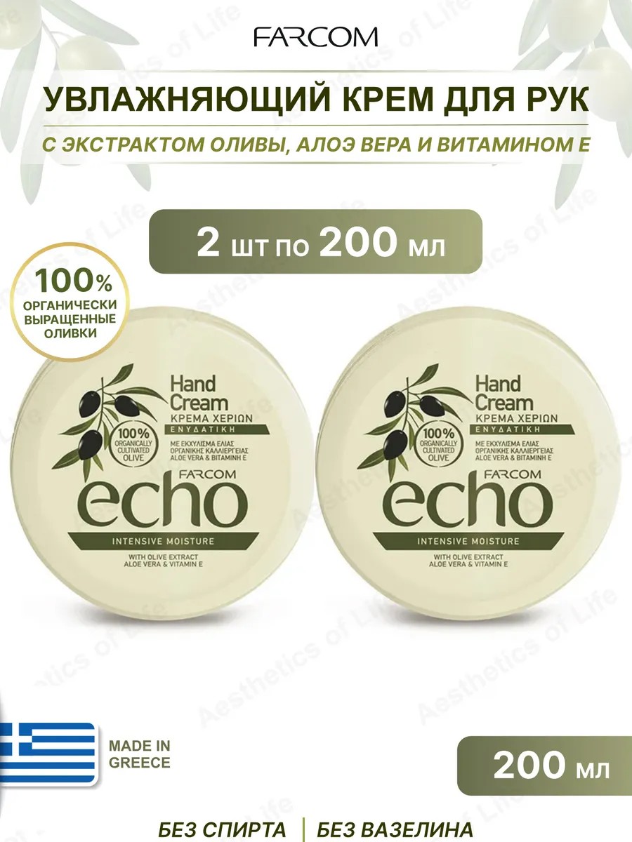 Увлажняющий крем для рук с экстрактом оливы, алоэ вера и витамином Е, Греция, 200 мл. Нежирный питательный крем для рук с экстрактом оливы, алоэ вера и Витамином Е Farcom ECHO, обогащенный натуральными увлажняющими антиоксидантами и противовоспалительными компонентами, которые делают руки мягкими и гладкими. Защищает кожу рук от агресивного воздействия внешней среды, холодов, пересушенного отоплением воздуха. Хорошо впитывается.Активные компоненты:оганический экстракт листьев оливы - содержит мощнейшие антиоксиданты, которые омолаживают кожу на клеточном уровне, укрепляют клеточные мембраны, защищают важные компоненты эпидермиса от повреждений и способствуют их воспроизводству Алоэ вера - предотвращает старение кожи, подтягивает её, обладает регенерирующим действием. Полисахариды и насыщенные аминокислоты, входящие в состав алоэ вера, образуют на коже защитную пленку, которая оберегает от ультрафиолетовых лучей и увлажняет ееВитамин Е - мощный антиоксидант, которые оберегает липидный слой кожи и обладает способностью снижать вредное воздействие УФ-лучей на кожу.