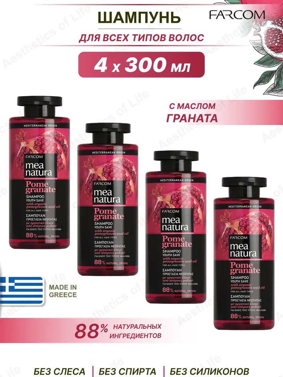 | Комплектация | Шампунь для всех типов волос с маслом граната 300 мл Греция - 4 шт |