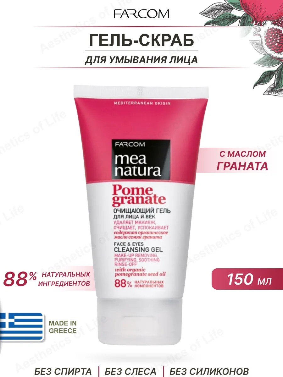Очищающий гель для умывания для лица и глаз с маслом граната MEA NATURA Pomegranate, Греция, 150 мл. Гель для ежедневного очищения кожи лица и глаз Mea Natura. Содержит натуральный комплекс органического масла гранатовых косточек, биосахаридов, растительных экстрактов и экстрактов цитрусовых, обеспечивает защиту от свободных радикалов, а также тонизирует и освежает кожу. Эффективно удаляет макияж и загрязнения. Мягко очищает, не пересушивая кожу. Мгновенное оживляет кожу, помогая поддерживать ее естественный баланс влаги, делает кожу гладкой и сияющей. Подходит для снятия водостойкого макияжа.Не вызывает раздражения. Подходит для всех типов кожи. **СПОСОБ ПРИМЕНЕНИЯ** Аккуратно нанести на влажное лицо. Слегка помассируйте лицо в течение 2-3 минут до образования пены. Смойте большим количеством теплой воды.FARCOM - одна из крупнейших компаний косметической отрасли с более чем 50-летней историей. 100% производства в Греции.