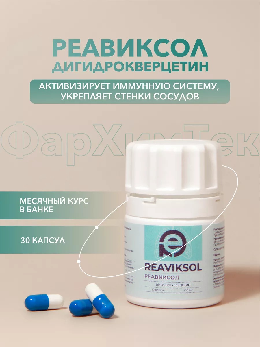Реавиксол (Дигидрокверцетин) - мощный природный антиоксидант и капилляропротектор нового поколения. Каждая капсула Реавиксола содержит профилактическую норму - 100 мг 98% биодоступного дигидрокверцетина, выделенного из даурской лиственницы. Реавиксол снижает вязкость крови, восстанавливает микроциркуляцию, улучшает транспортировку питательных веществ и кислорода к органам и тканям, активизирует иммунную систему, улучшает коронарный кровоток и сократимость миокарда, укрепляет стенки сосудов и капилляров, снижает уровень холестерина в крови. Реавиксол препятствует развитию опухолей, замедляет процесс биологического старения клеток, способствует улучшению функции центральной нервной системы и памяти, зрения и слуха, снижает риск развития гипертонии, стенокардии, инфаркта миокарда и инсульта. Реавиксол применяют для профилактики и лечения простудных и вирусных заболеваний, в том числе COVID-19, а также в постковидном восстановлении.
