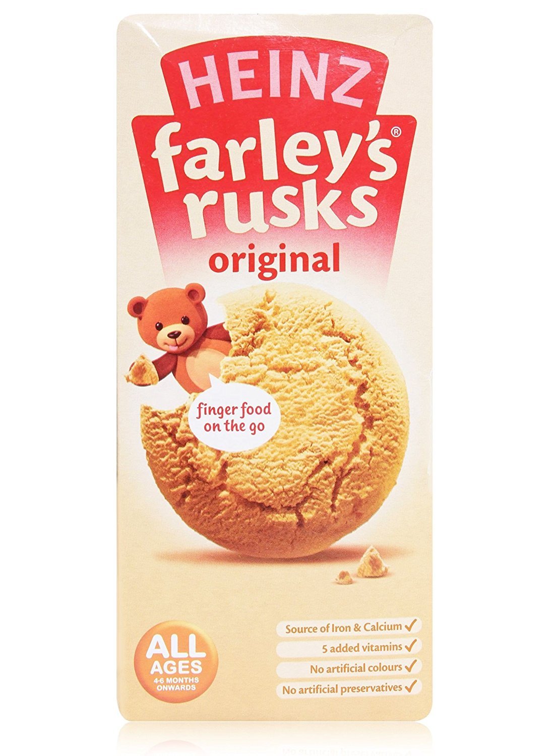 Farley's All Ages 4-6 Months Onwards Farley's Rusks Original INGREDIENTS WHEAT Flour, Sugar, Palm Oil, Raising Agents (Ammonium Carbonates), Calcium Carbonate, Emulsifier (Monoglycerides), Niacin, Iron, Thiamin, Riboflavin, Vitamin A, Vitamin DContains GLUTEN No added MILK Ingredients but made in a bakery which uses MILK SAFETY WARNING Safety at meal times always make sure that a responsible person is present when your baby is feeding. Your health visitor or doctor can advise you on infant feeding. Remember to brush teeth regularly. Use as part of a varied weaning diet. MANUFACTURER CONTACT INFORMATION South Building Hayes Park Hayes Middlesex Ub4 8Al See more