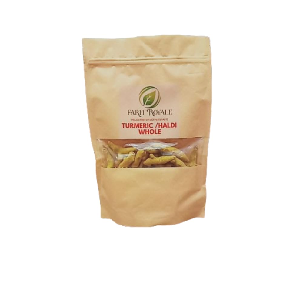 Discover the essence of purity with Farm Royale Turmeric Haldi Whole, a product that embodies quality, sustainability, and social responsibility. Our turmeric is 100 pure and natural, free from any additives or preservatives, ensuring you receive only the best. Each batch of turmeric is handpicked by experienced farmers, guaranteeing the highest quality and authenticity. Our turmeric is sourced directly from local farms, fostering a direct-from-farm concept that supports small-scale farmers and ensures the freshest product reaches your kitchen. This approach not only benefits consumers with superior quality but also uplifts the farming community by providing them with fair and direct market access. Farm Royale is committed to eco-friendly practices. We employ sustainable farming methods that protect and preserve our environment, ensuring that our turmeric is grown in harmony with nature. Our dedication to the environment is matched by our commitment to social causes. We actively support women empowerment in farming communities, providing opportunities and resources to women, promoting gender equality and strengthening the socio-economic fabric of rural areas. Our turmeric meets export quality standards, making it a premium choice for both domestic and international markets. It is versatile and can be used in various culinary applications, skincare routines, and wellness practices. Whether you're adding a golden hue to your favorite curry, creating a soothing face mask, or brewing a health-boosting turmeric tea, our turmeric is your perfect companion. The health benefits of turmeric are well-known. Incorporating turmeric into your daily routine can aid in digestion, support joint health, and boost your immune system. With Farm Royale Turmeric, you are not just choosing a spice you are embracing a product that is Shudh and authentic, retaining its natural essence and flavor. Enhance your dishes with its vibrant color and rich taste, and experience the multitude of benefits that come with every pinch of this golden spice. Choose Farm Royale Turmeric Haldi Whole for a product that stands for purity, quality, sustainability, and empowerment. Make a difference in your kitchen and in the lives of those who grow this wonderful spice.Enhanced Flavor: Adds a vibrant color and rich taste to your dishes, making your meals more delightful. Shudh Authentic: Our turmeric is unadulterated and retains its natural essence and flavor. Versatile Uses: Ideal for culinary use, skincare, and wellness routines, adding a golden touch to your daily life. Export Quality: Meets international standards, making it a premium choice for both domestic and global markets. Women Empowerment: Our initiative supports and empowers women in farming communities, promoting gender equality. Eco-Friendly Practices: Produced using sustainable farming methods that respect and preserve the environment. Direct from Farm: Sourced directly from local farms, guaranteeing freshness and supporting small-scale farmers. Handpicked Material: Carefully selected by expert farmers, our turmeric is handpicked to ensure the best quality. 100 Pure and Natural: Our turmeric is free from additives and preservatives, ensuring you get the highest quality and purity.