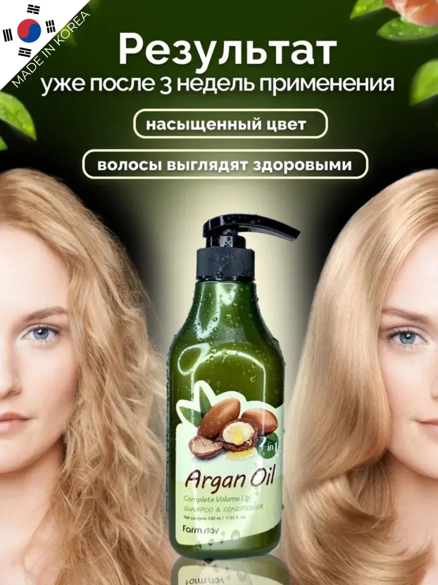 Шампунь-кондиционер 2в1 Farm Stay с аргановым маслом для окрашенных волос укрепляет и стимулирует их рост. При использовании Вы получите не только красивые, но и густые локоны, которые будут восхищать всех вокруг. Линейка шампуней Фарм стей, разработана специально для женщин, которые хотят получить максимальный результат сразу. Превосходно подойдет для тех, кто мечтает о шелковистых, вьющихся и блестящих волосиках. Это лучший друг в борьбе с сухостью и ломкостью волосяных волокон. Вы сможете наслаждаться здоровой, гладкой и послушной шевелюрой каждый день. Бальзам по достоинству оценят блондинки, брюнетки и девушки которые стремятся к идеальной прическе. Shampoo professional для ежедневного применения всей семьи: мужчин, подростков мальчиков и девочек. Корейская уходовая косметика - это залог качества и инноваций. Нежная формула помогает избежать раздражения и появление перхоти. Это хороший выбор для тех, кто ценит пенящийся эффект, глубокое очищение, питание, увлажнение и SOS восстановление. Жирные пряди часто связаны с повышенной выработкой себума, который выделяется дермой. Бальзам-маска содержит ингредиенты, которые способствуют регулированию выделения жира, купируя его излишнее образование. Маска-бальзам это универсальный подарок для мамы, коллеги, любимой жены, подруги на день рождения или другой особый случай. Некоторые варианты от Фарм-стей имеют оттеночные свойства, что позволяет придать кудрям желаемый оттенок. Это отличный способ обновить цвет без тонирования. Кондиционер в составе эффективно очищает волосинки, минимизируя риск пересушивания и повреждения. При милировании шапмунь поможет сохранить интенсивность и яркость, а также защитить от выцветания. Вся продукция от FarmStay содержит только натуральные компоненты, не вредит окружающей среде, не тестируется на животных и сертифицирована веганским сообществом. Закажите шампунь-ополаскиватель прямо сейчас, Вы заслуживаете самого наилучшего!