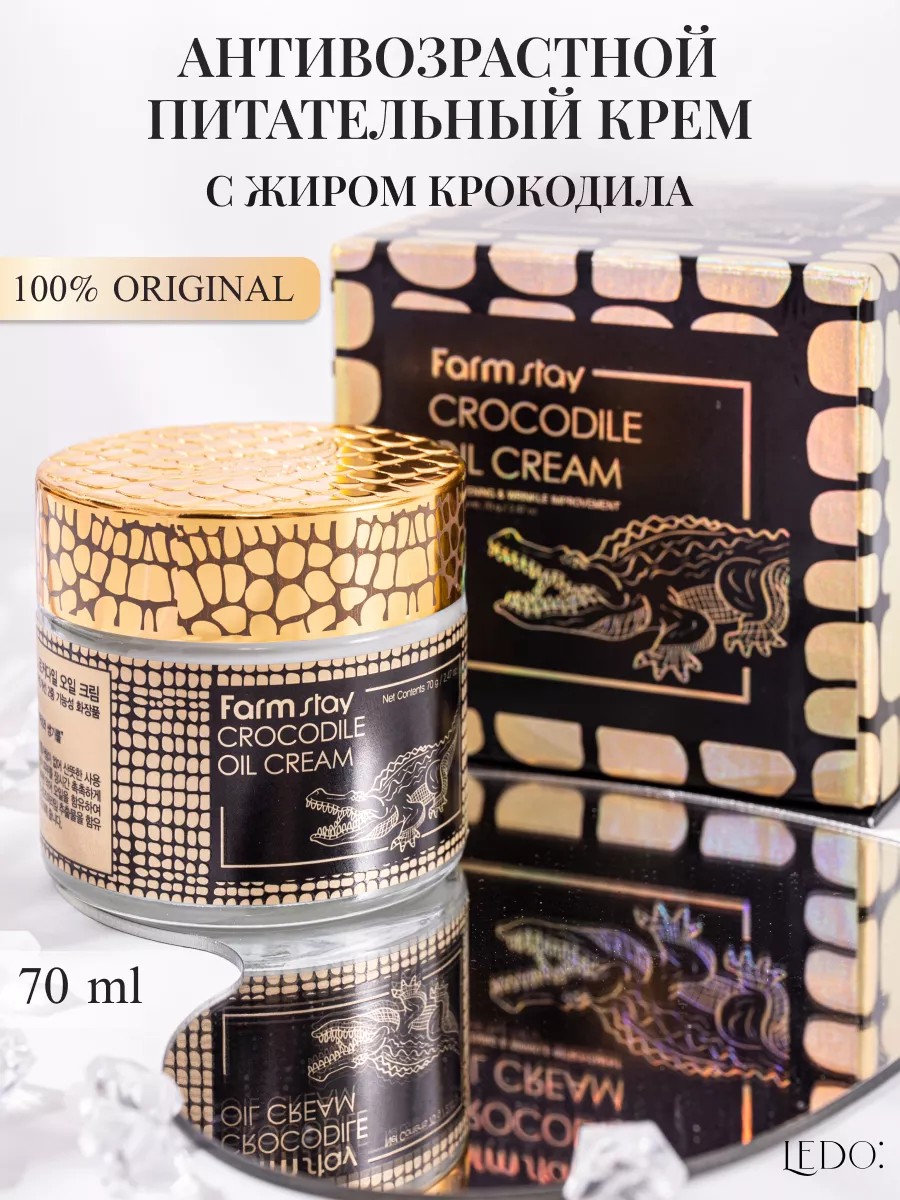 Nourishing face cream with crocodile fat Crocodile Oil Cream from the Korean brand FARMSTAY actively combats age-related skin changes, smoothes wrinkles, saturates the skin with fatty acids, smoothes it, eliminates flaking, tightness, dryness and discomfort, and improves the elasticity and firmness of the skin.