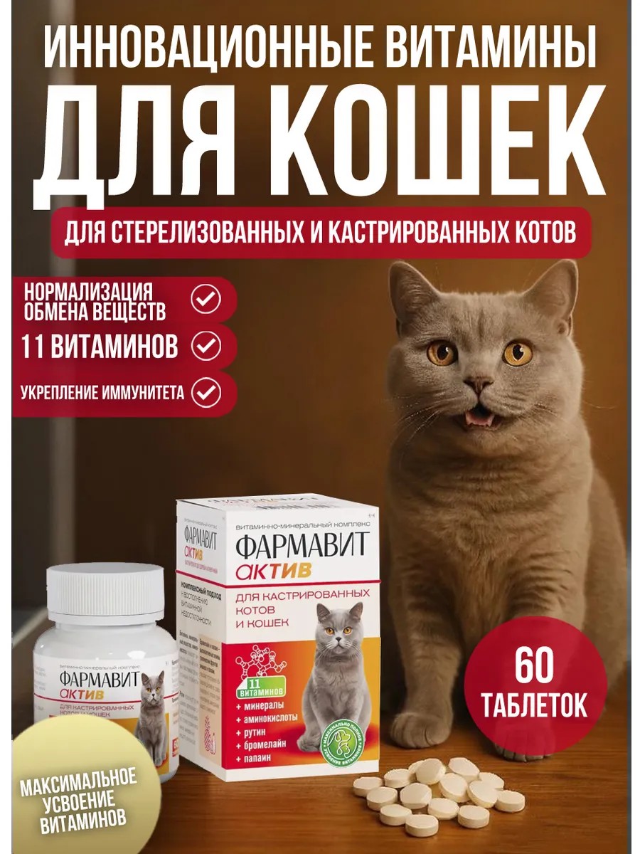 Фармавит Актив – витаминно-минеральный комплекс нового поколения с фруктовыми энзимами.Нормализует обмен веществ в организме кастрированных котов и кошек и укрепляет иммунитет.Восполняет дефицит пищеварительных ферментов.Повышает ферментный потенциал организма.Улучшает усвоение питательных и биологически активных веществ.Решает специфические проблемы кастрированных кошек: предупреждает ожирение, снижает риск возникновения мочекаменной болезни. Применение и дозировкаПрименение: один раз в сутки в течение 14-30 дней с кормом или независимо от приема основного корма в дозе: Кошкам менее 3 кг — 1 таблетка; Кошкам более 3 кг — 2 таблетки.Фармавит Актив совместим со всеми ингредиентами кормов и лекарственными препаратами.Побочных явлений и осложнений не выявлено.Противопоказаний не установлено.