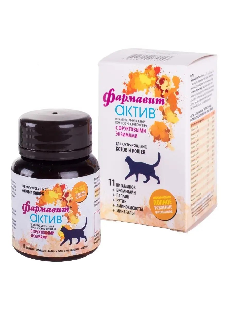 Фармавит Актив - витамины для кастрированных котов и стерилизованных кошек мелких и крупных пород, мультивитамины с фруктовыми энзимами. Рекомендуется для нормализации обмена веществ и укрепления иммунитета, предупреждения ожирения, снижения риска возникновения мочекаменной болезни. Бромелайн и Папаин - фруктовые энзимы для максимально полного усвоения витаминов организмом, Рутин - для профилактики возникновения аллергических реакций, Метионин - для поддержания pH мочи на физиологическом уровне, профилактики образования камней, Таурин - для поддержания остроты зрения и нормальной работы сердечно-сосудистой системы. Инструкция: рекомендуется 1 раз в сутки в течение 14-30 дней: кошки менее 3 кг - 1 таблетка, кошки более 3 кг - 2 таблетки. Состав: Жирорастворимые витамины: А, D3, Е, Водорастворимые витамины группы В и Н (биотин), рутин, Фруктовые энзимы: бромелайн, папаин, Аминокислоты: метионин, таурин, Минеральные вещества: кальций, фосфор, Основа таблетки: пивные дрожжи. Совместимо со всеми ингредиентами сухих и влажных кормов и витаминами для животных без риска передозировки. Используйте витамины после болезни, от линьки, при выпадении шерсти. Фармавит Актив - лучшие витамины при натуральном кормлении. Подходит для пожилых животных.