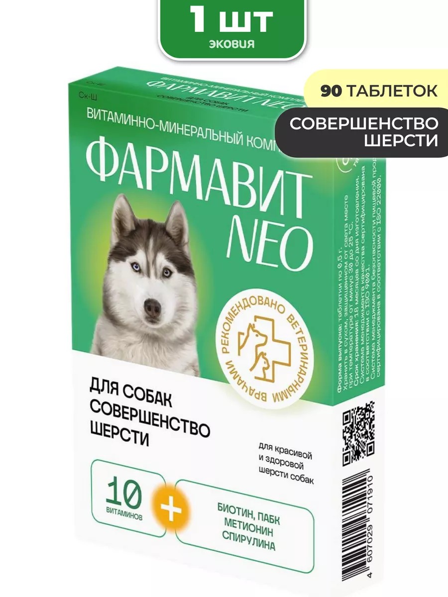 | Комплектация | Витаминно-минеральный комплекс Фармавит NEO для собак Совершенство шерсти (90 таблеток); Количество упаковок указано на главном фото; В каждой упаковке 90 таблеток |