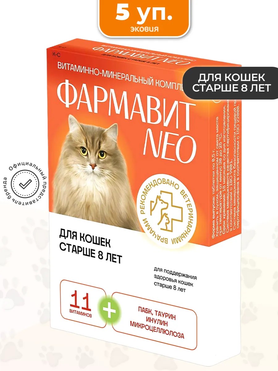 Фармавит Neo – это витаминно-минеральный комплекс, разработанный специально для пожилых кошек и взрослых кошек старше 8 лет. Фармавит Нео представляет собой кормовую добавку, которая помогает поддерживать здоровье и активность кошек.