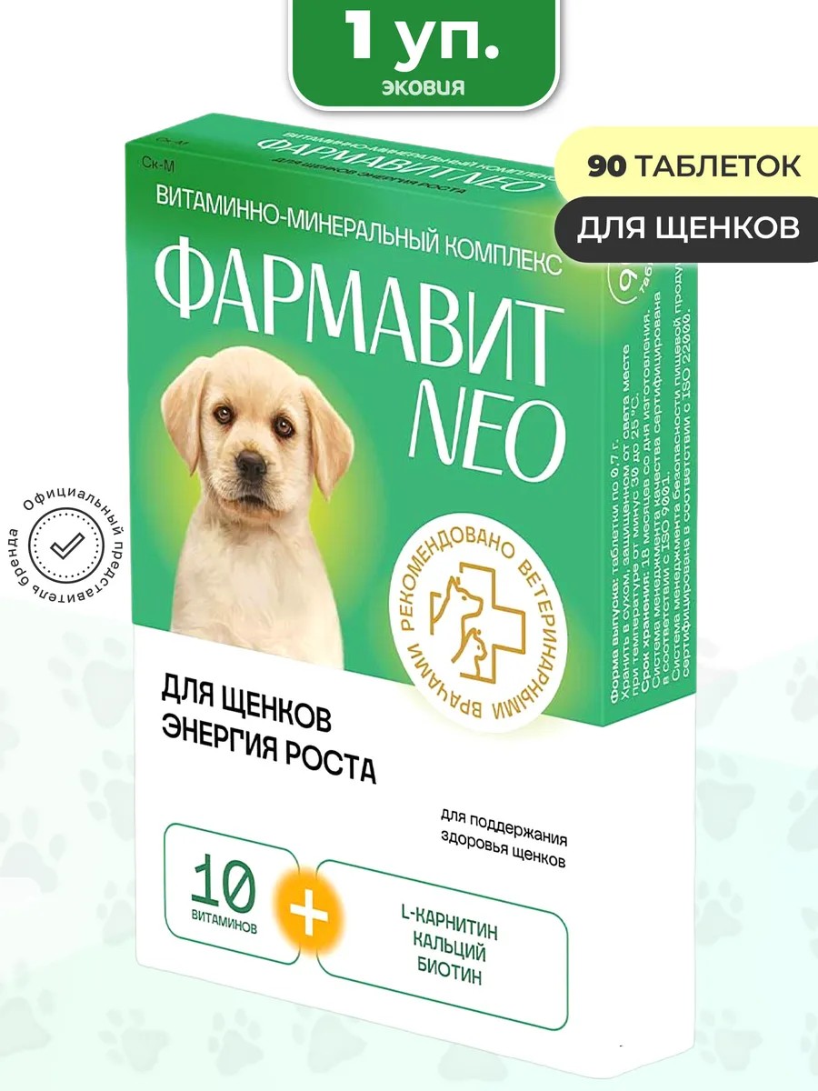 | Package contents | Farmavit NEO vitamin and mineral complex for puppies Growth energy (90 tablets); The number of packages is indicated in the main photo; Each package contains 90 tablets |