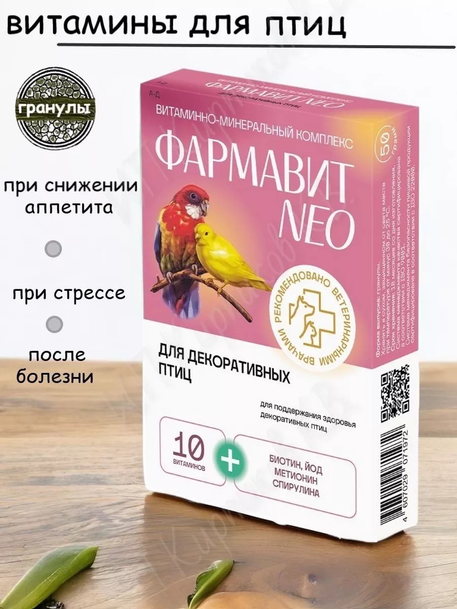 Фармавит Neo - витамины для птиц, комплекс мультивитаминов, аминокислот и минералов, подобранных с учетом физиологических особенностей декоративных птиц (попугаев, голубей, канарейки). Рекомендуется для предупреждения гиповитаминоза и нарушений обмена веществ, улучшения структуры пера, повышения активности иммунной системы.