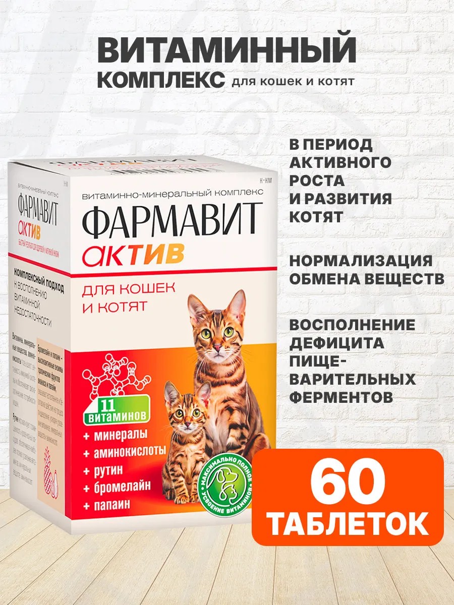Фармавит Актив – витаминно-минеральный комплекс с фруктовыми энзимами, специально разработанный для кошек и котят.