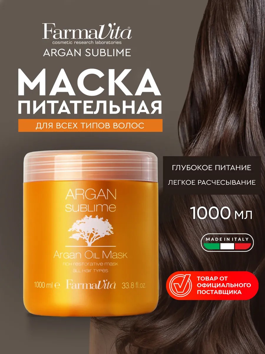 Маска для волос ARGAN Sublime MASK, обогащенная аргановым маслом это люксовая серия средств для ухода за волосами от профессионального бренда FarmaVita. Специально разработана для интенсивного питания волос, придания им объема, мягкости и блеска. Идеально подходит для всех типов волос, особенно поврежденных и с сухими кончиками. Отлично сочетается с шампунем ARGAN Sublime. Ваши волосы выглядят как после салонного ухода.