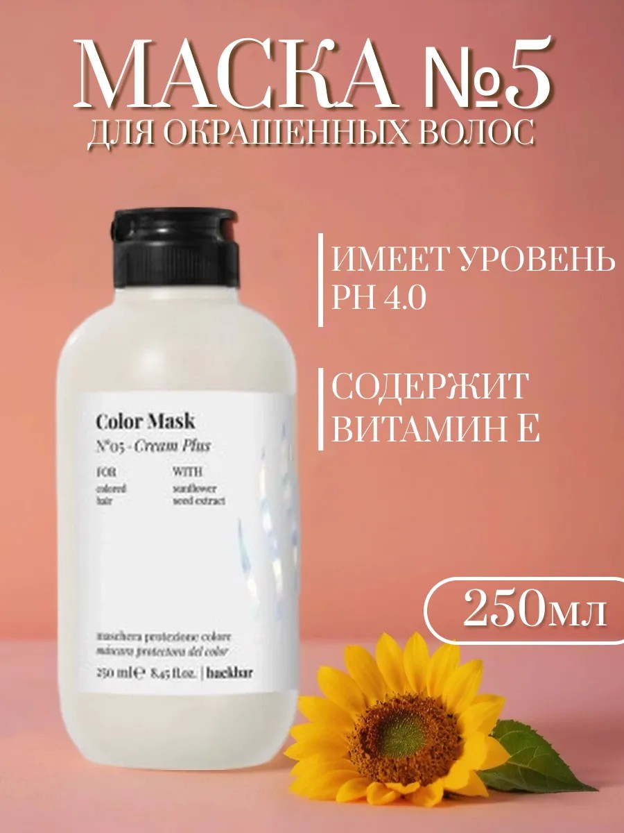 Маска COLOR №05 для окрашенных волос с насыщенной кремовой текстурой. Профессиональная маска обогащена экстрактом семян подсолнечника, который богат витамином Е и линоленовой кислотой. Они наполняют клетки кислородом, заживляют мелкие повреждения, способствует укреплению структуры волос, также помогают волосам и коже головы оставаться увлажненными и эластичными. Насыщенная формула маски №05 backbar помогает продлить яркость окрашенных волос, питая и придавая им блеск, а кремовая текстура облегчает расчесывание. Защитный крем обладает приятным ароматом пассифлоры.
