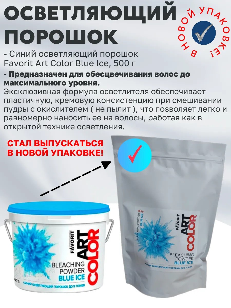 Blue bleaching powder Favorit Art Color Bleaching Powder Blue Ice - for hair bleaching to the maximum level. The exclusive formula of the product provides a plastic, creamy consistency when mixing the powder with an oxidizer, which allows you to easily and evenly apply it to the hair, working as in the open bleaching technique. The powder contains buffering substances that help maintain the pH of the mixture at the same level during the bleaching process, as well as protective components that protect the hair body from damage.