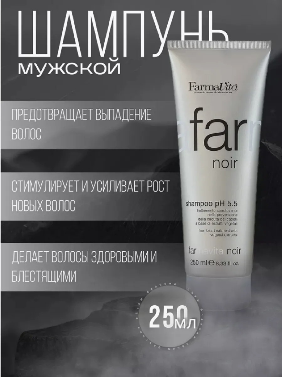 Специальная линия для мужчин - Программа для предотвращения выпадения волос FARMAVITA NOIR, включает в себя специальные шампунь и лосьон, обогащенные драгоценными растительными экстрактами. Это богатая формула эффективно проникает внутрь кожи, стимулируя и усиливая рост новых волос. Розмарин, горная арника, шалфей и зверобой, входящие в состав FARMAVITA NOIR, улучшают состояние кожи, которое было нарушено усиленной работой сальных желез и образованием перхоти, делают волосы здоровыми и блестящими. Экстракт перечной мяты дает приятное и продолжительное ощущение свежести.Итальянский бренд FarmaVita представляет укрепляющий шампунь против выпадения волос Noir Shampoo pH 5.5. Нейтральный рН позволяет использовать его для всех типов волос, а также для сухой, чувствительной кожи головы, склонной к появлению перхоти и аллергических реакций. Шампунь на основе растительных экстрактов разработан специально для борьбы с выпадением волос у мужчин. Комплекс активных компонентов помогает справиться с алопецией, вызванной стрессом, гормональными изменениями, сменой климата, неправильным образом жизни. Шалфей, зверобой, горная арника и другие травы успокаивают раздраженную кожу, пробуждают спящие волосяные луковицы и стимулируют рост новых, крепких и здоровых, волос. это хороший подарок для парней и мужчин на все праздники и просто так, без повода. Можно купить шампунь против перхоти мужской 2в1 своему другу, брату и коллеге. Шампунь мужской для волос от перхоти с кофеином и пироктон оламином понравится вашим родным и близким.
