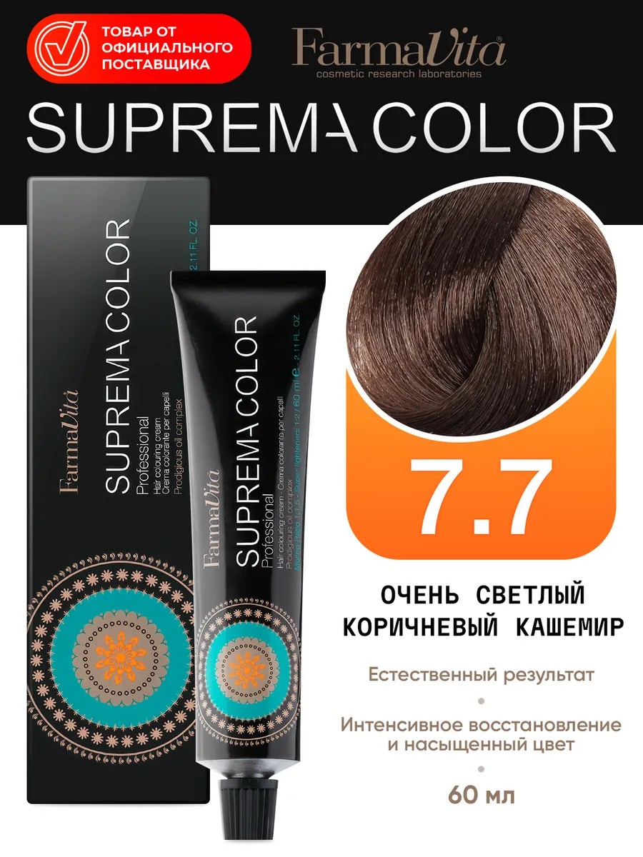| Комплектация | Профессиональная краска для волос Suprema 7.7 очень светлый коричневый |